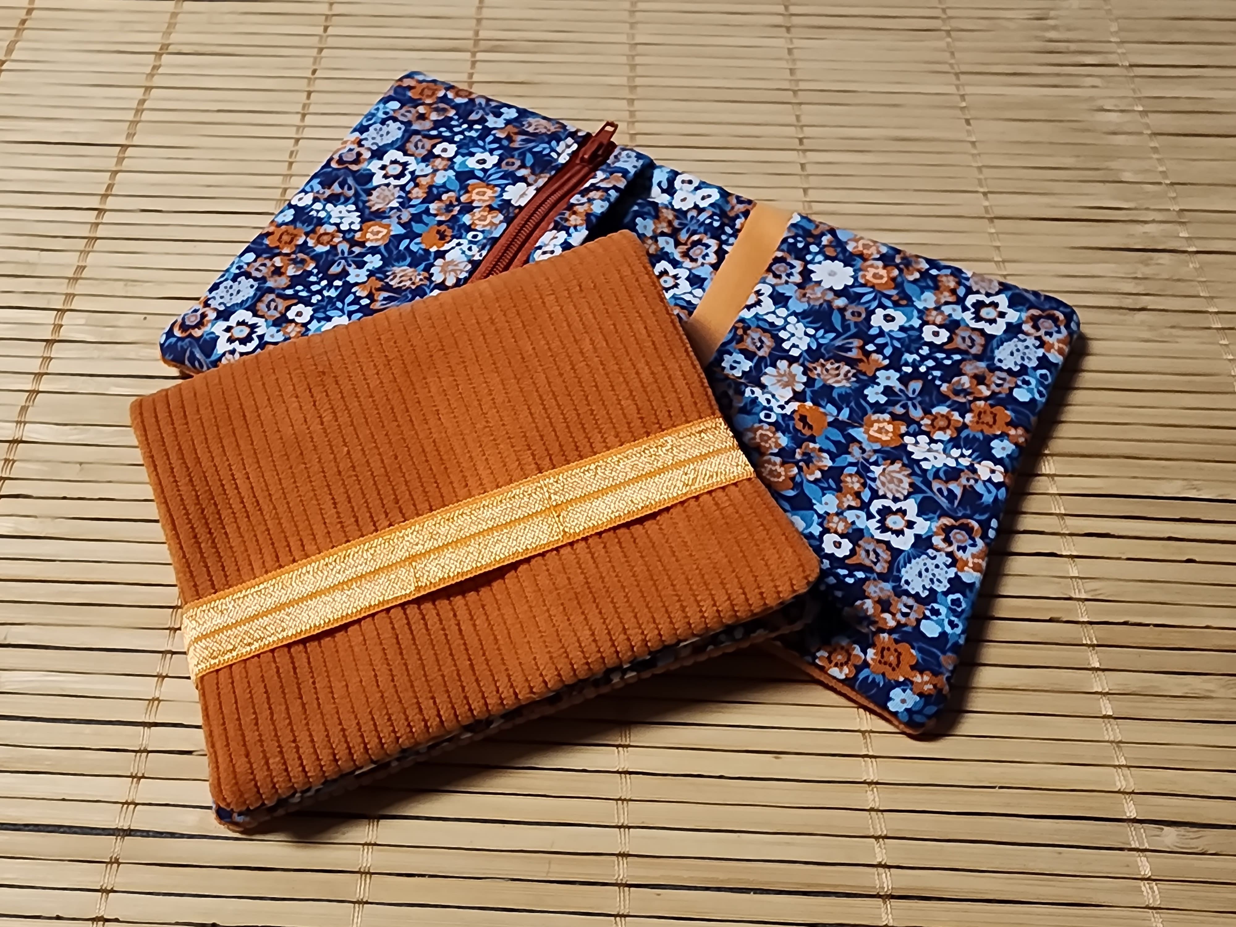 Portefeuille velours côtelé minimaliste ton orange fleurs bleu fermeture éclaire porte monnaie porte carte tissus fermeture élastique