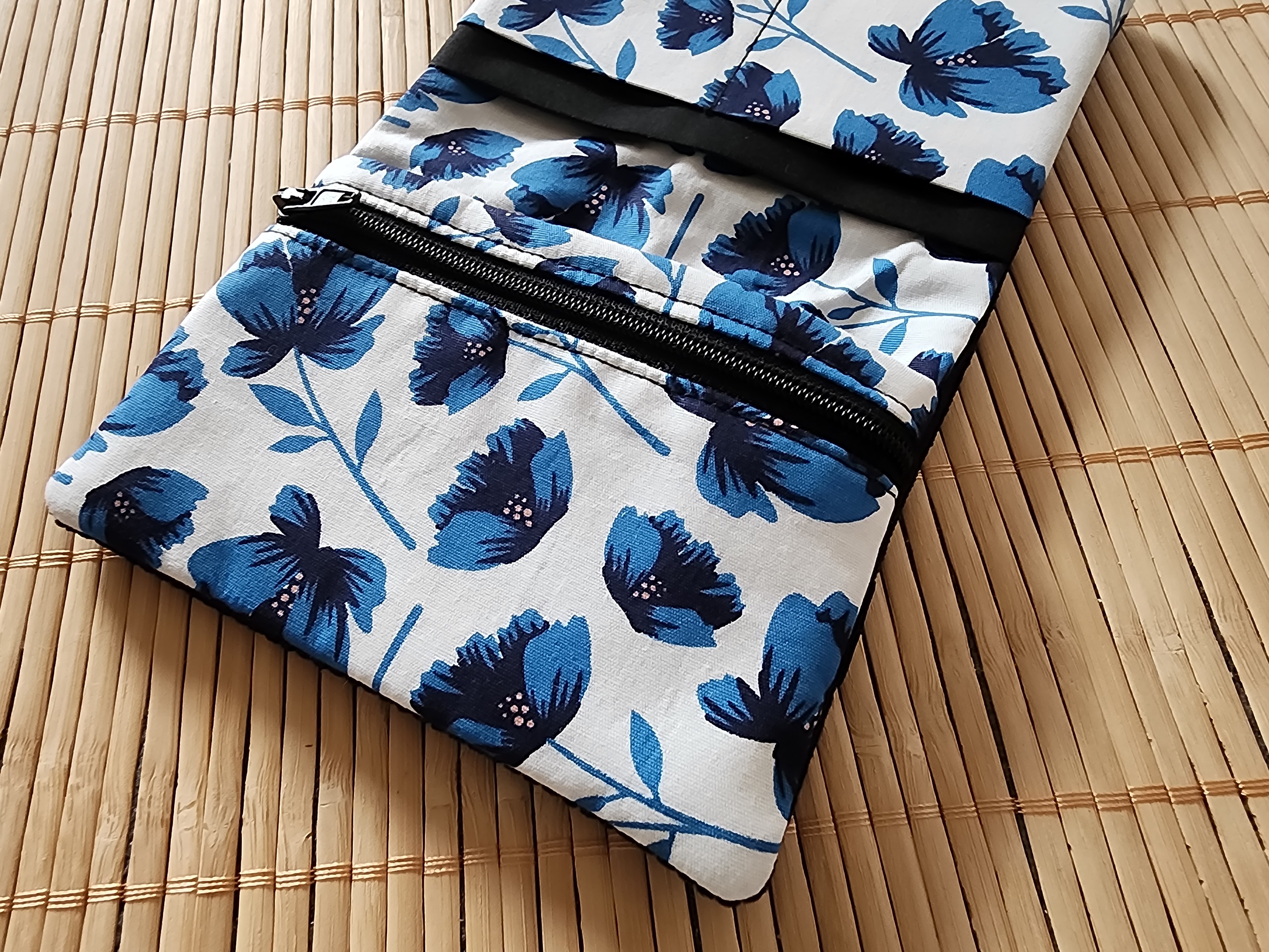 Portefeuille velours côtelé minimaliste ton noir fleurs bleu et noir fermeture éclaire porte monnaie porte carte tissus fermeture élastique