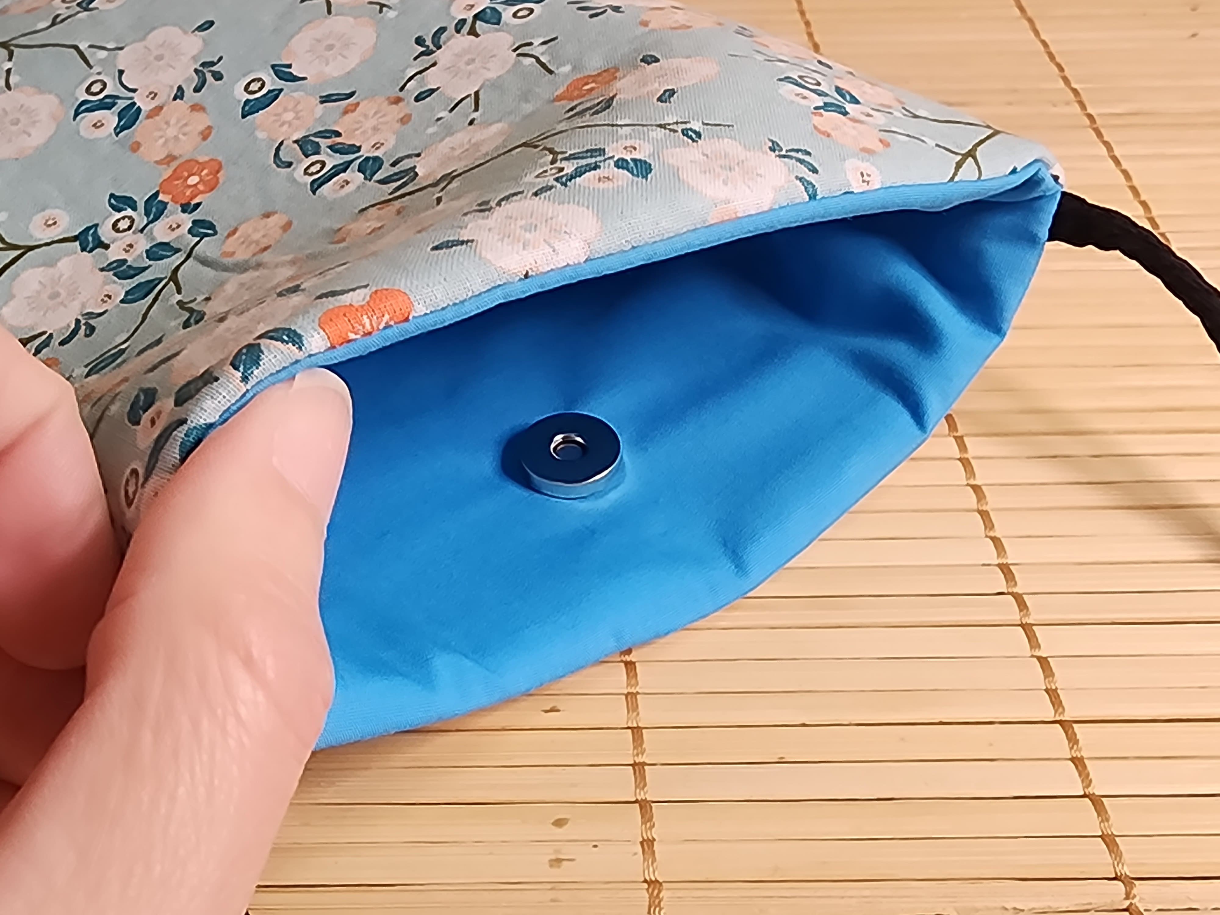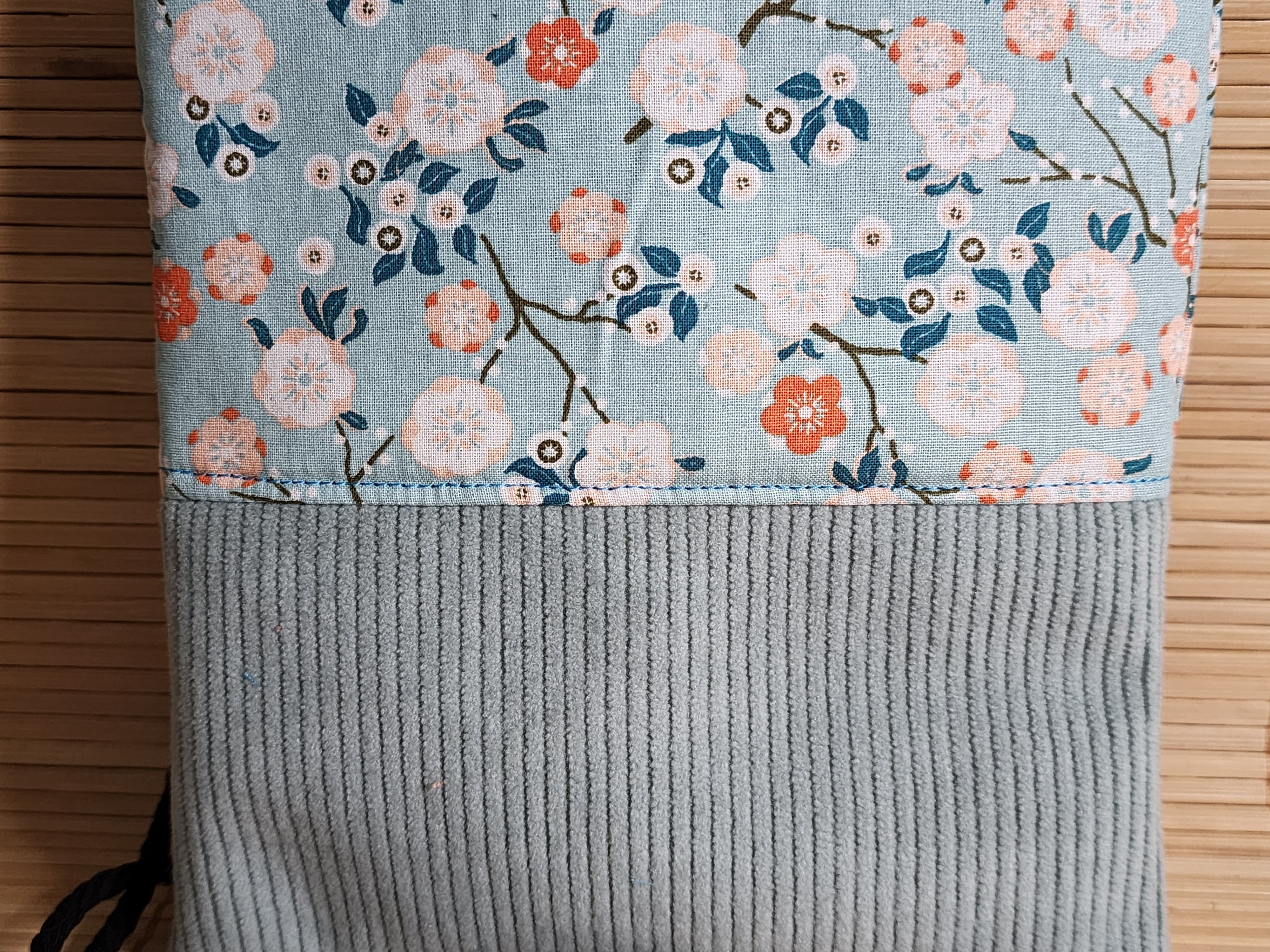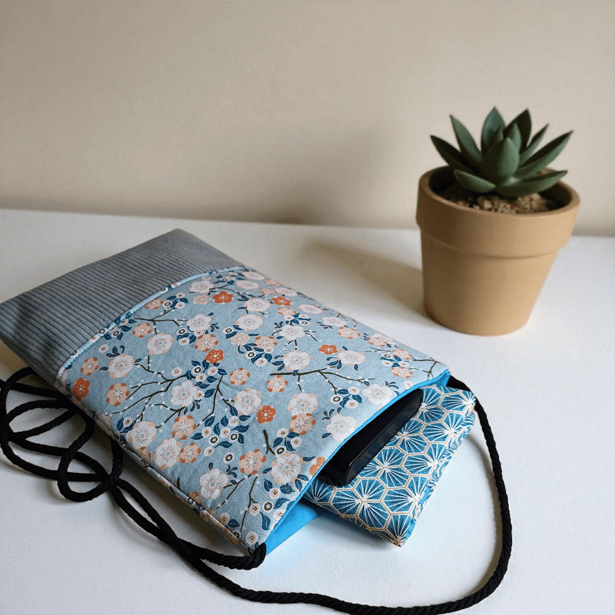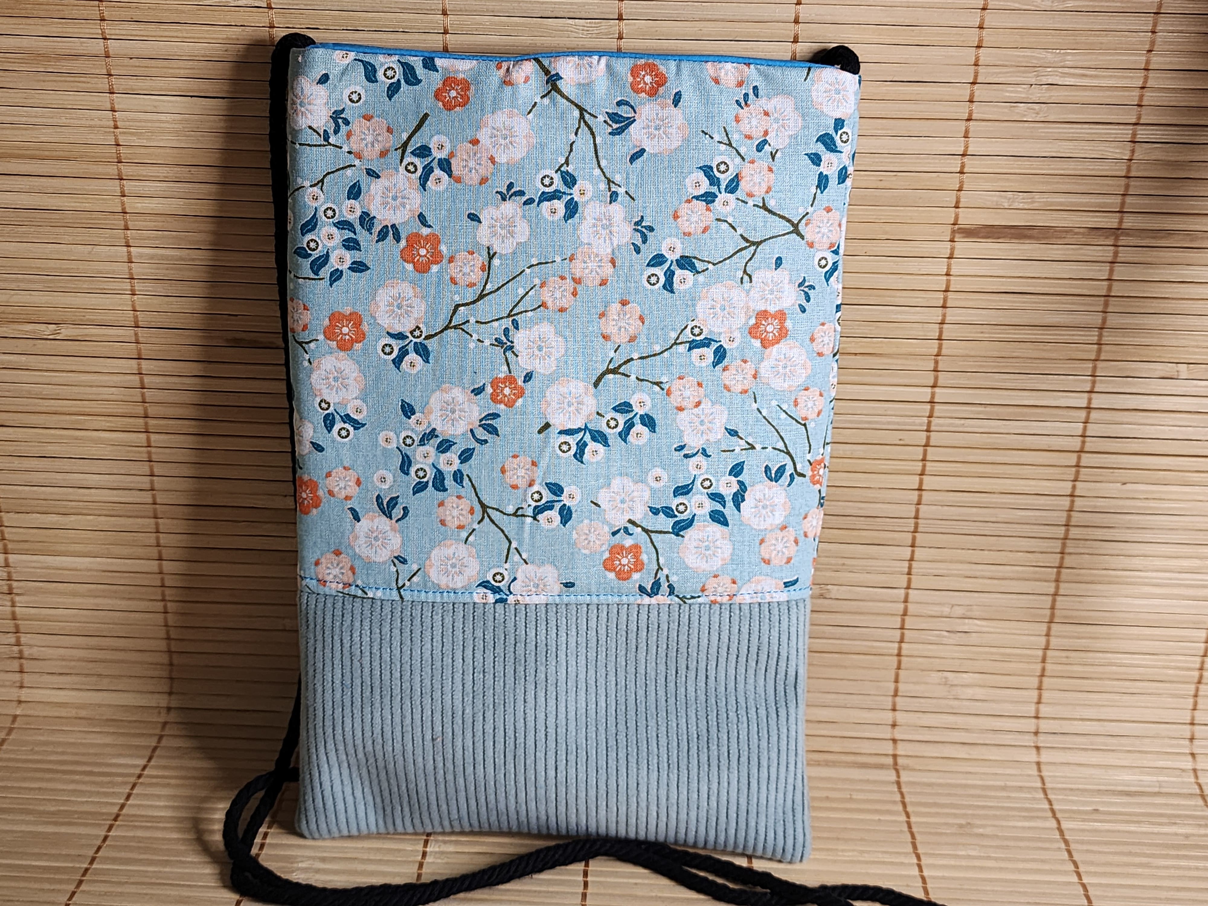 Pochette téléphone petit sac bandoulière tissu japonais bleu clair et velours côtelé pochette porte monnaie fermeture aimanté