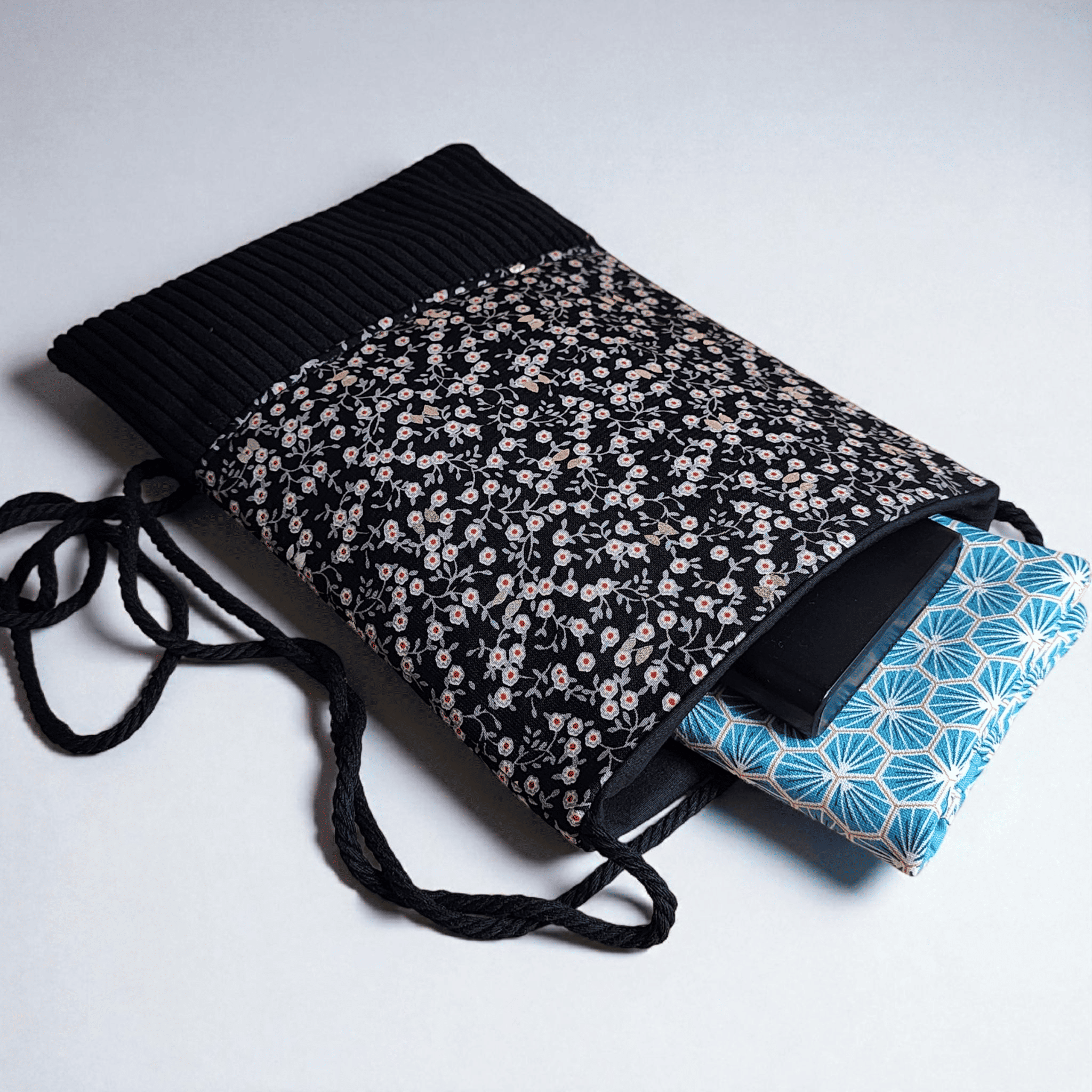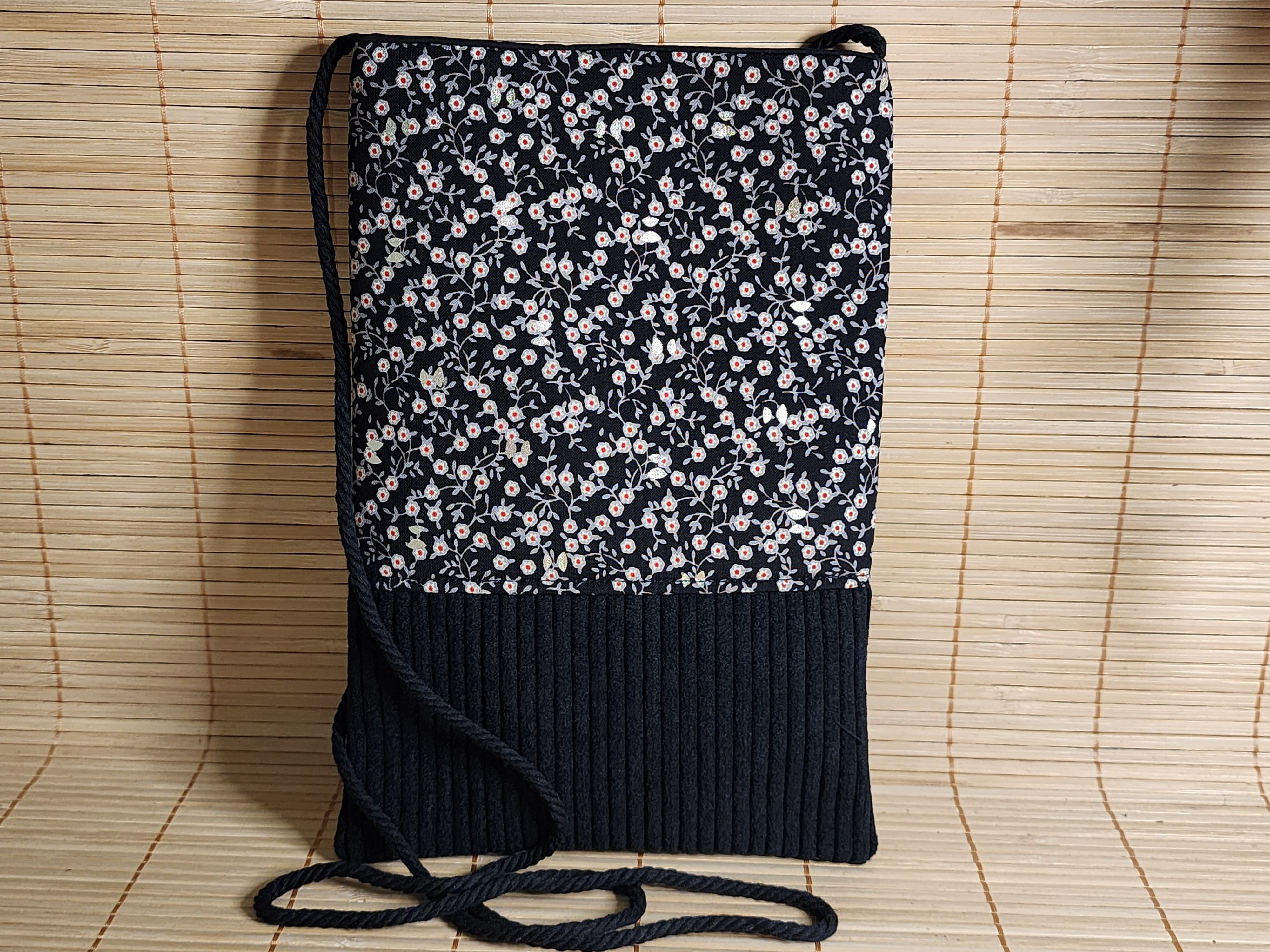 Pochette téléphone petit sac bandoulière tissu fleurs noir et argenté et velours côtelé pochette porte monnaie fermeture aimanté