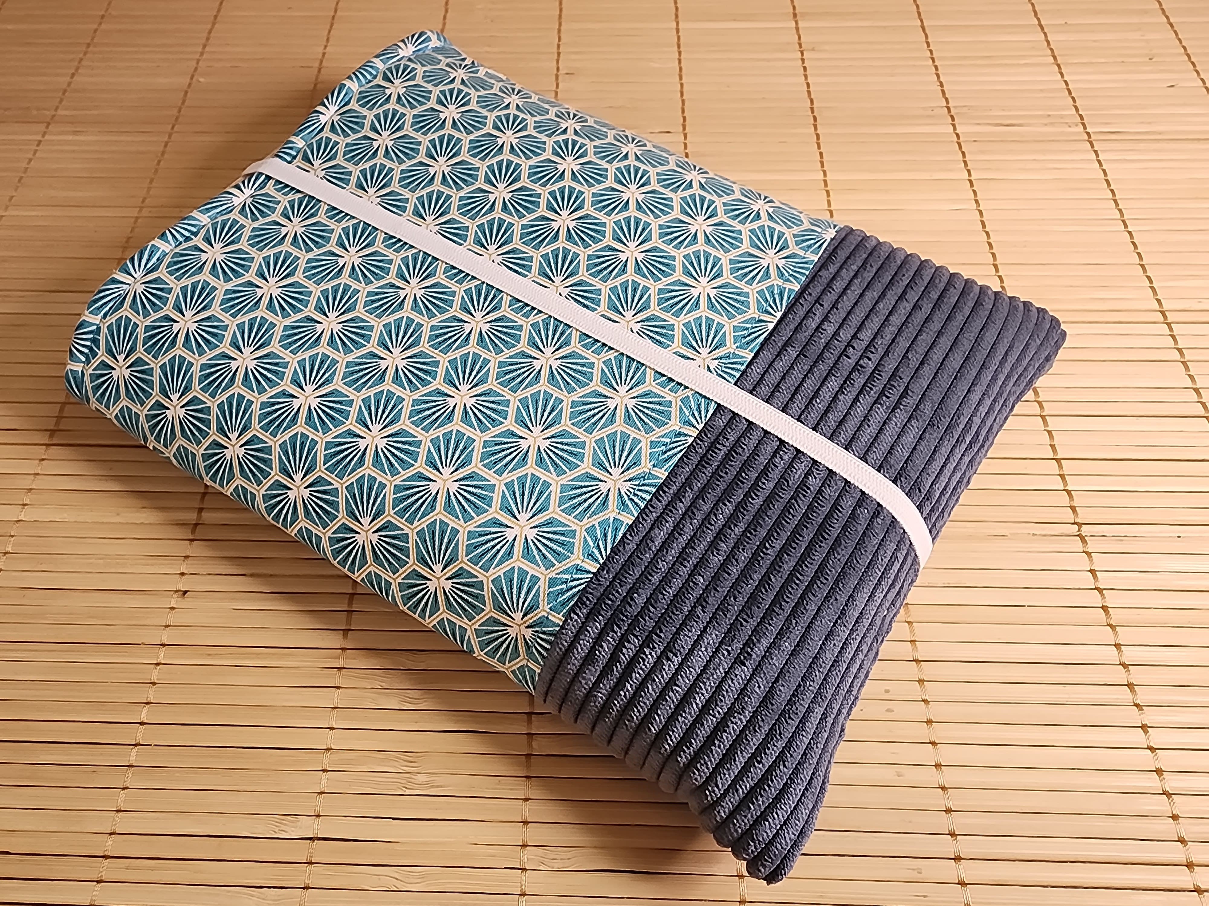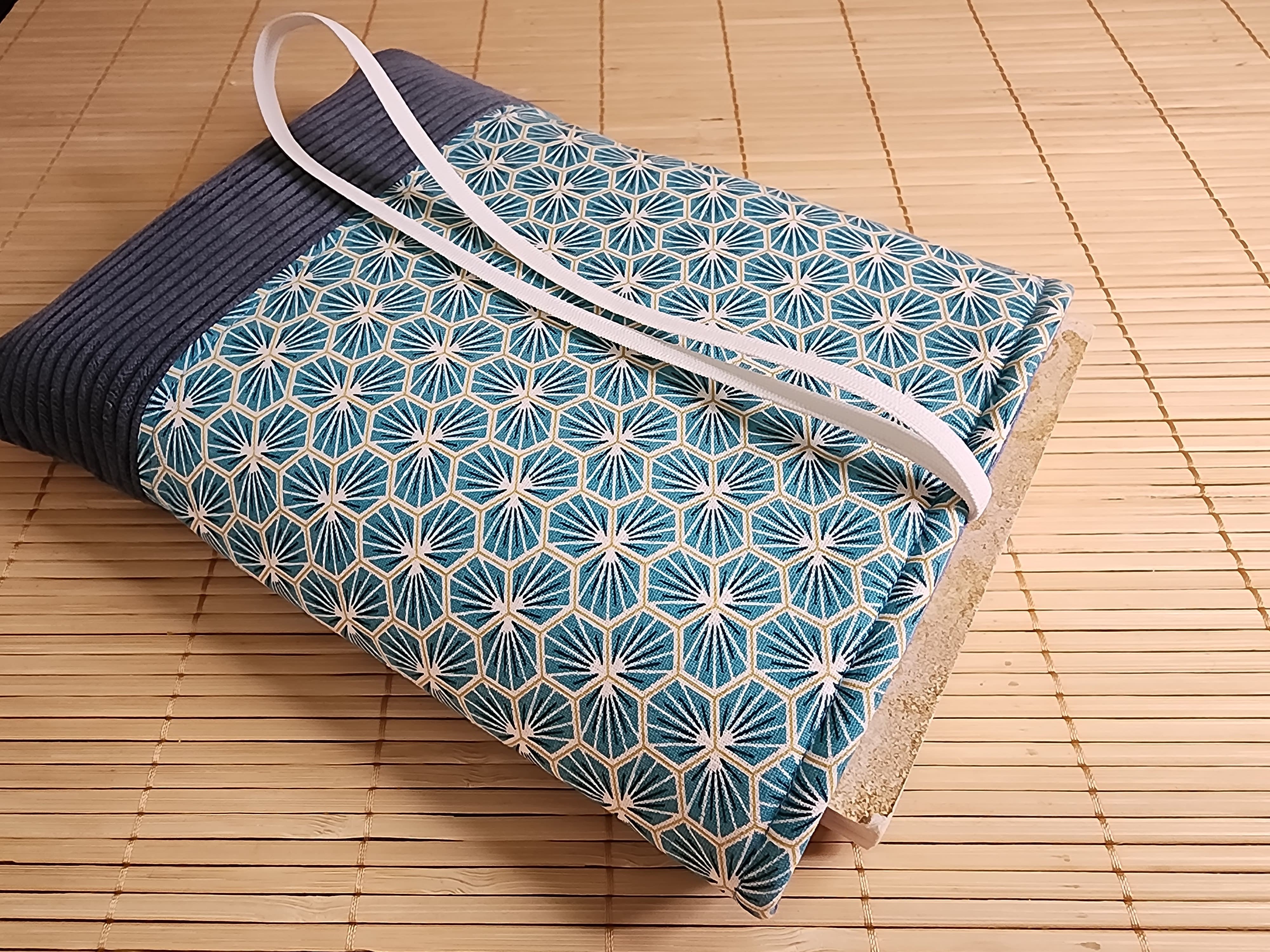 Pochette à livre en tissus riad bleu et velours côtelé fermeture élastique étui à livre protection livre de poche