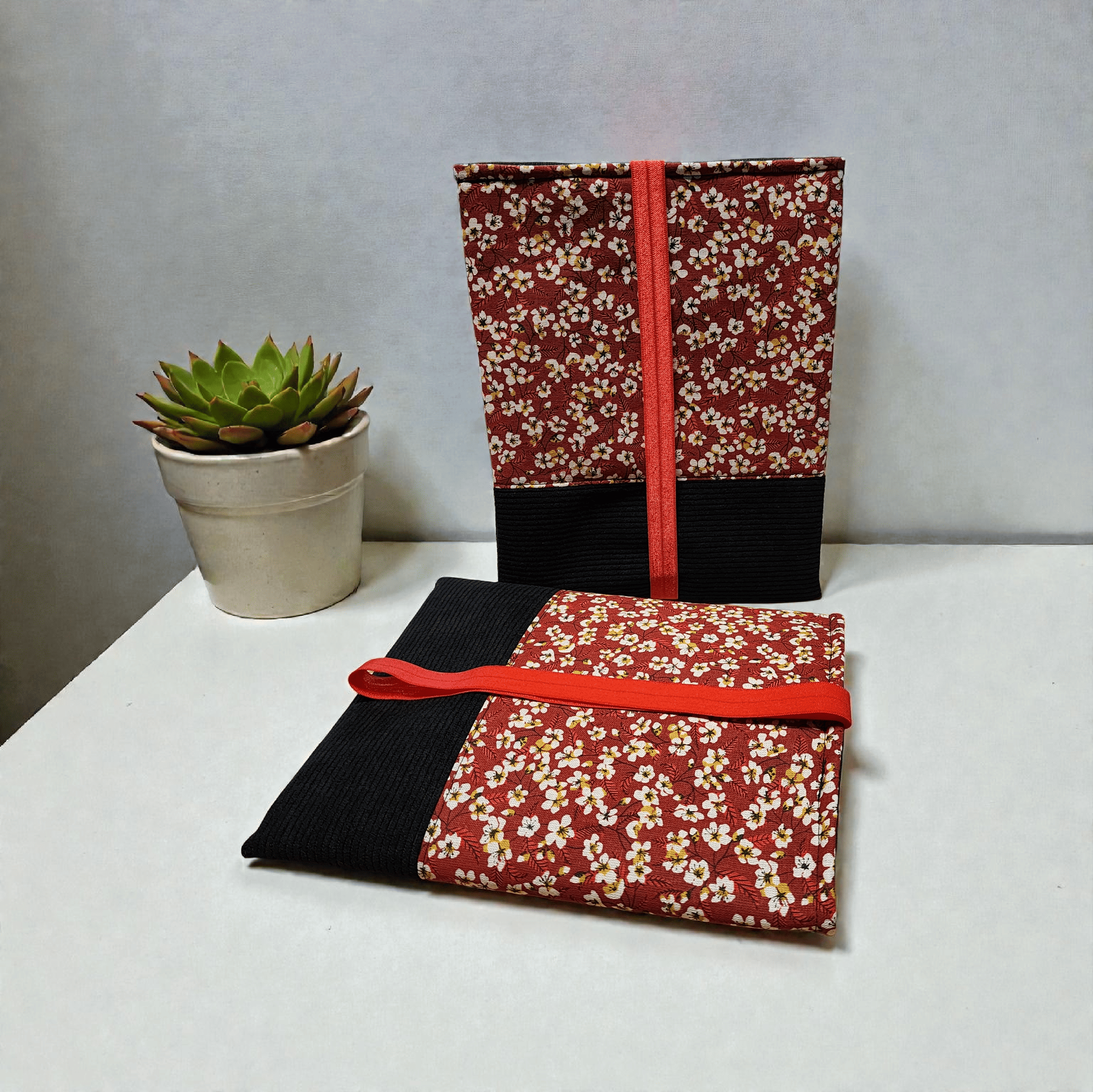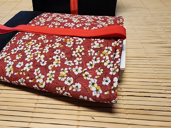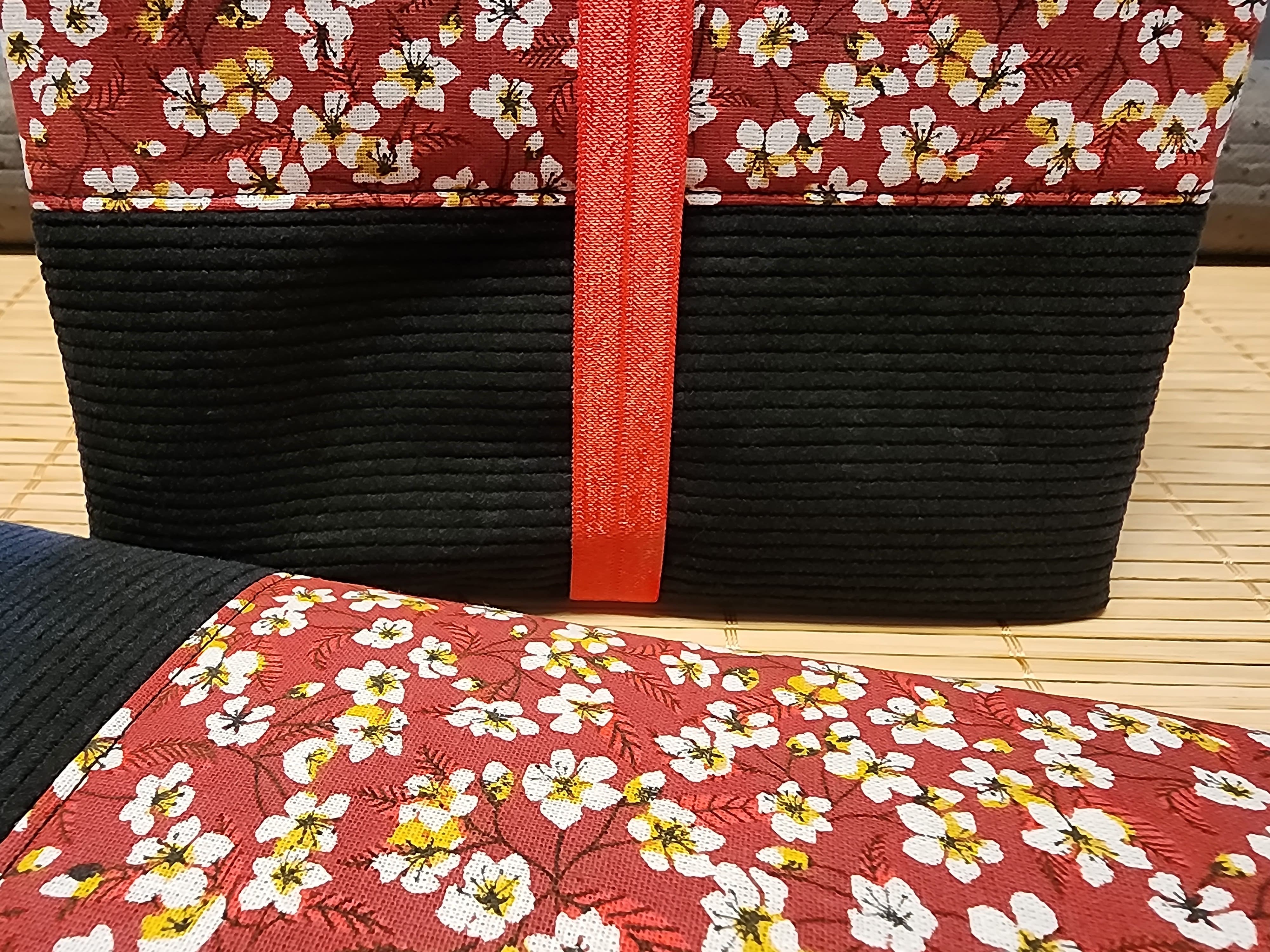 Pochette à livre en tissus fleurs amandier rouge et velours côtelé fermeture élastique étui à livre protection livre de poche