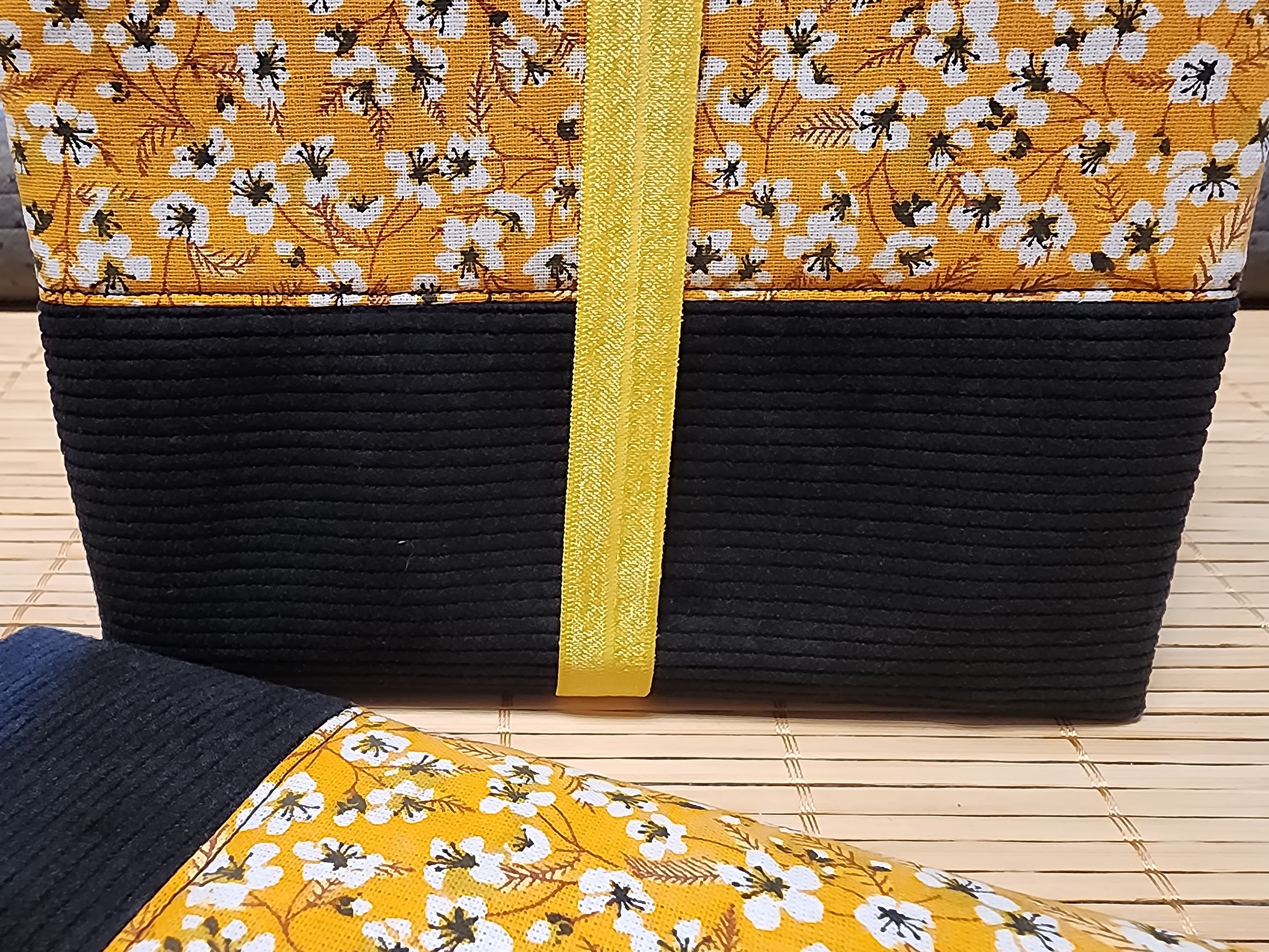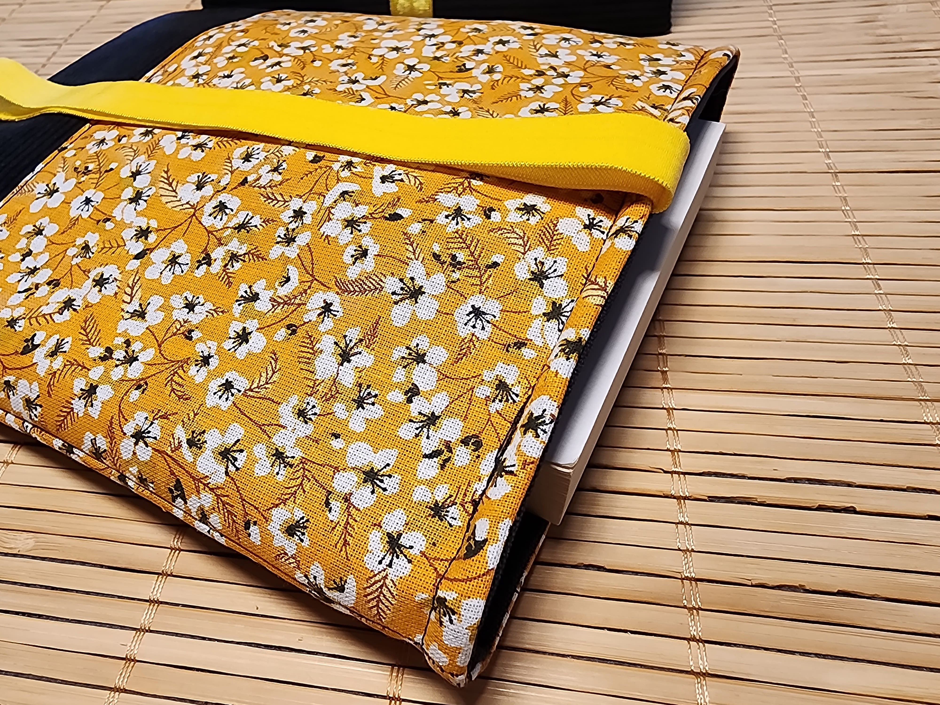 Pochette à livre en tissus fleurs amandier jaune et velours côtelé fermeture élastique étui à livre protection livre de poche
