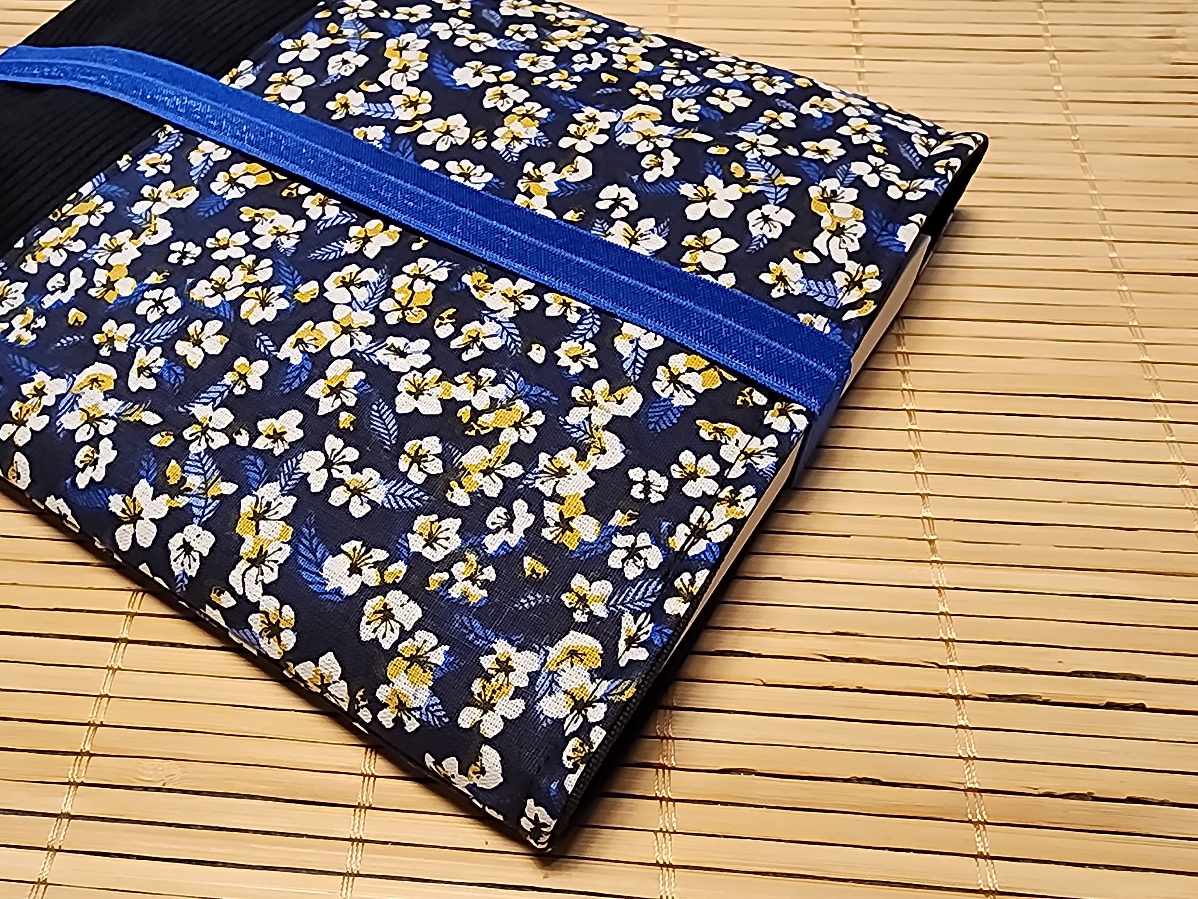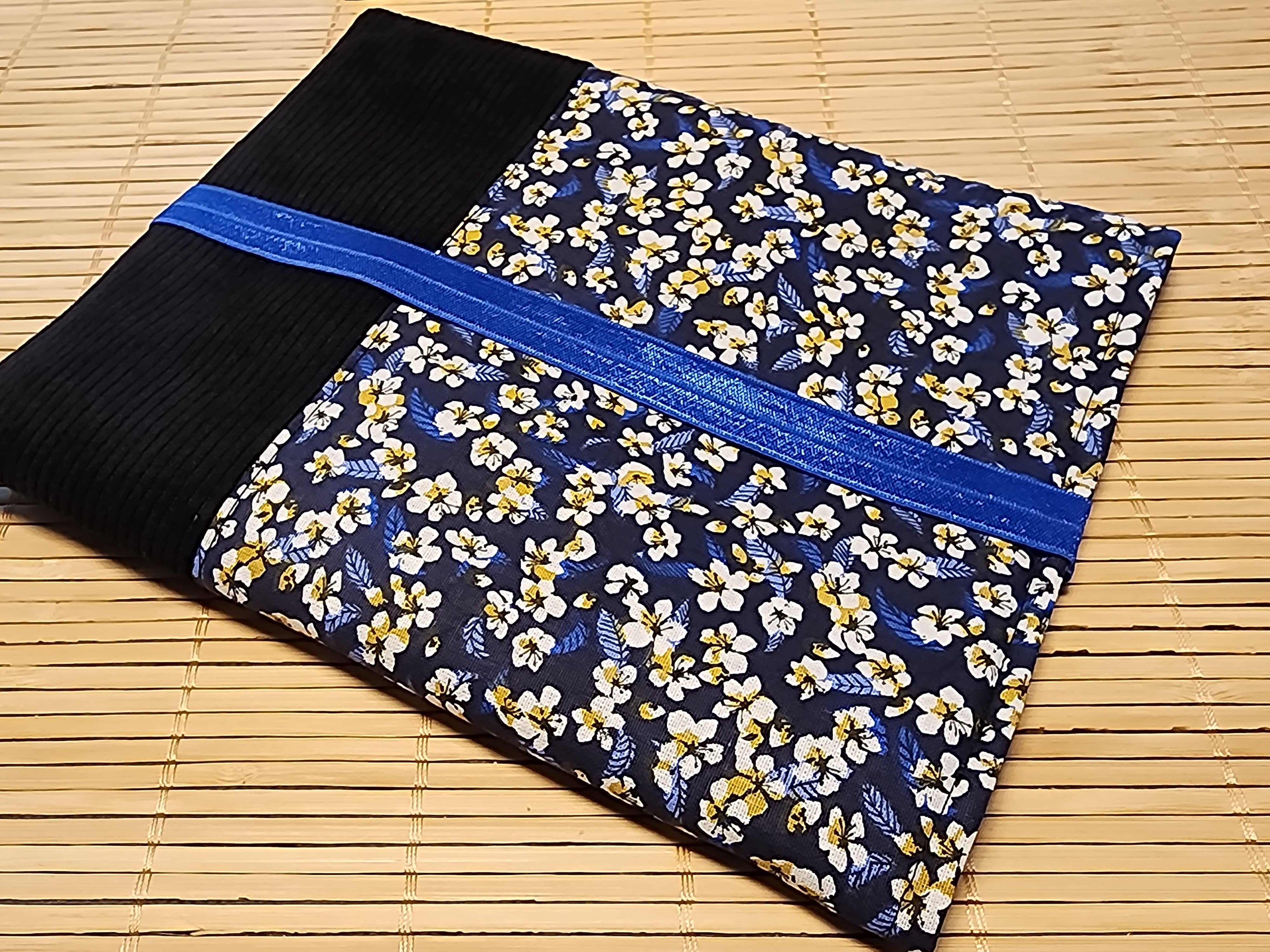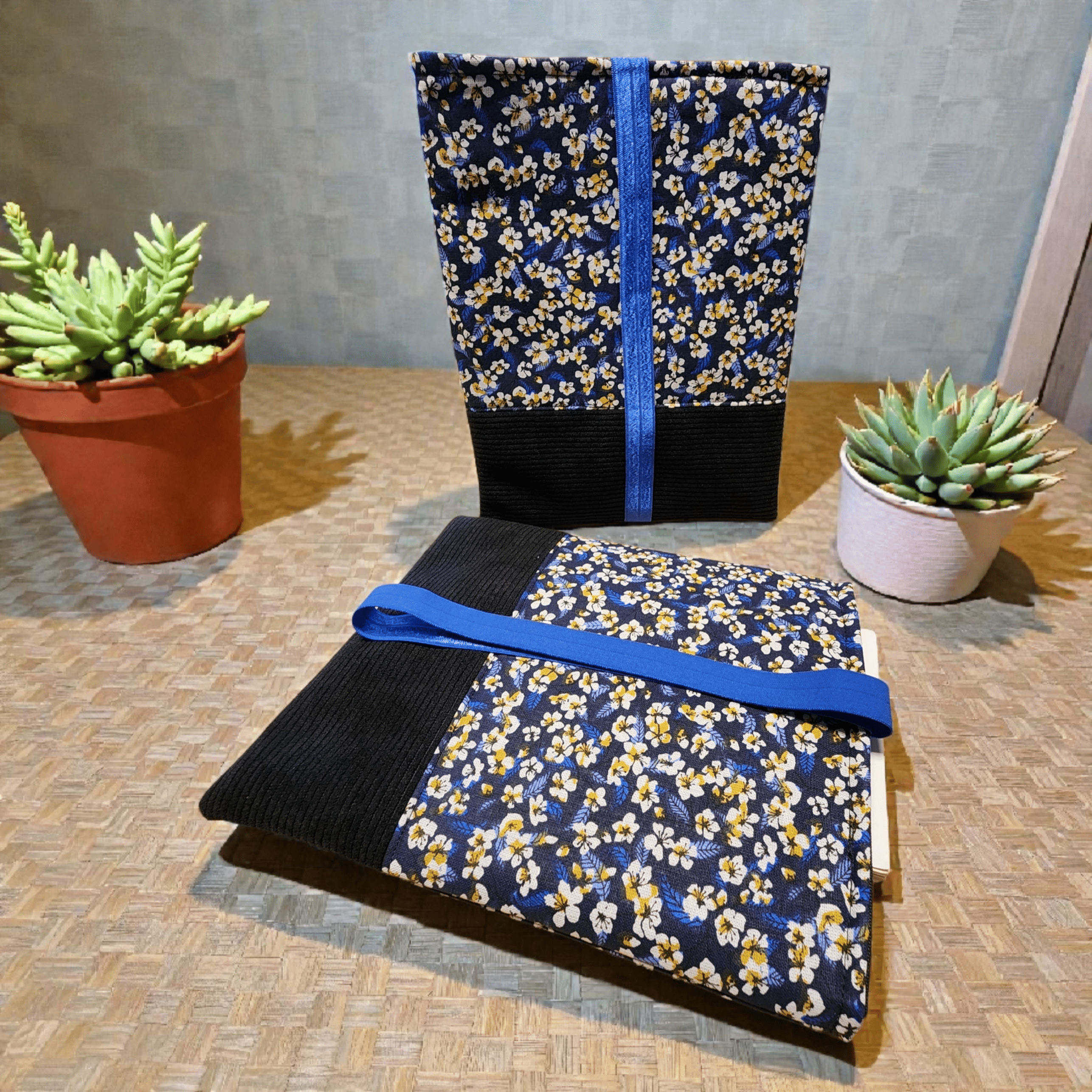 Pochette à livre en tissus fleurs amandier bleu et velours côtelé fermeture élastique étui à livre protection livre de poche