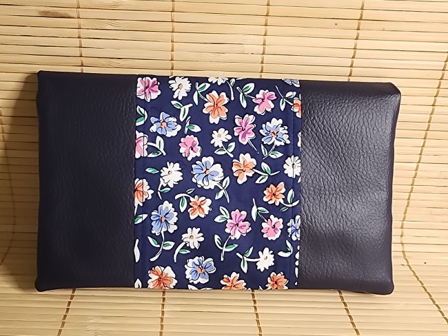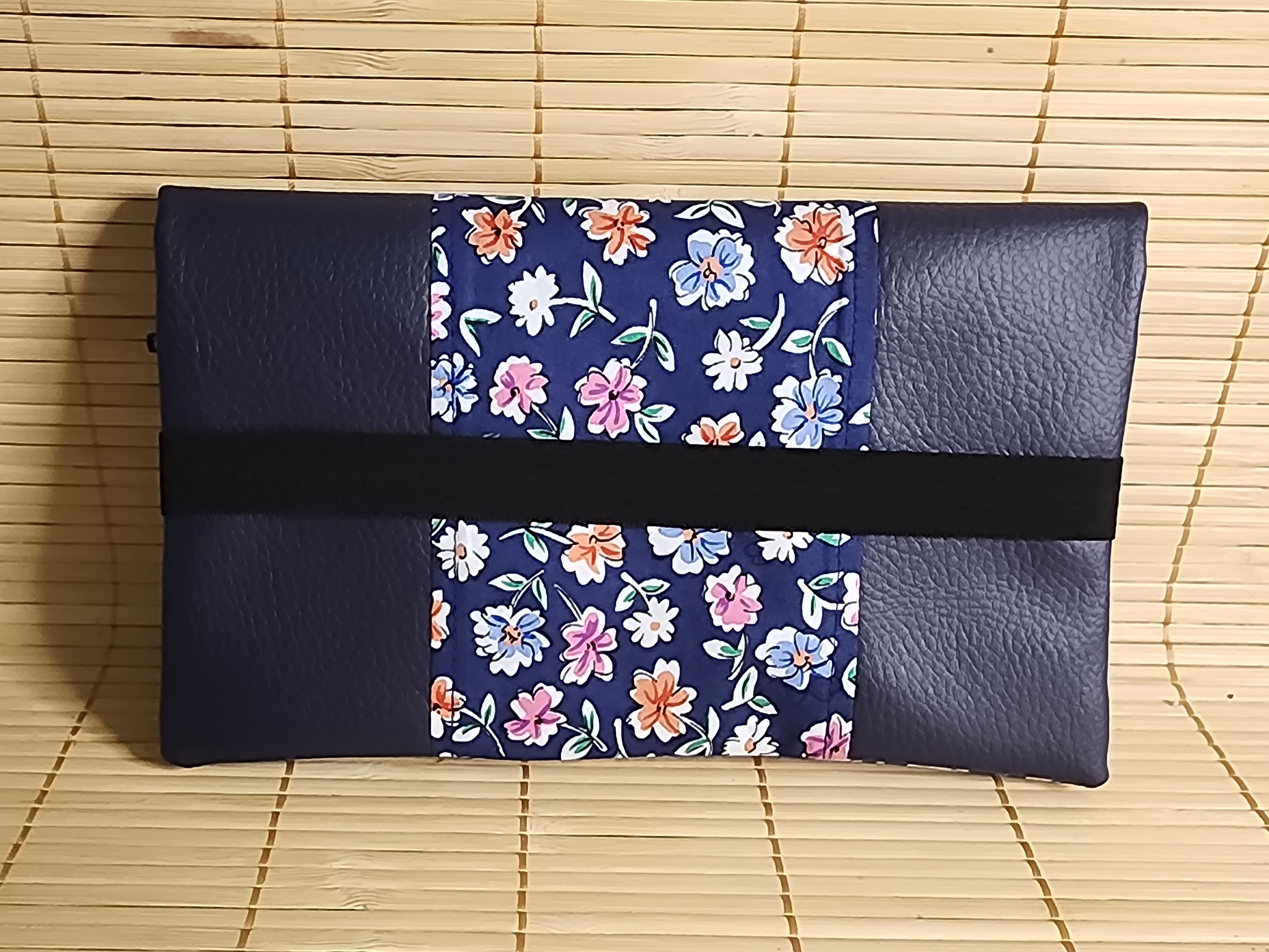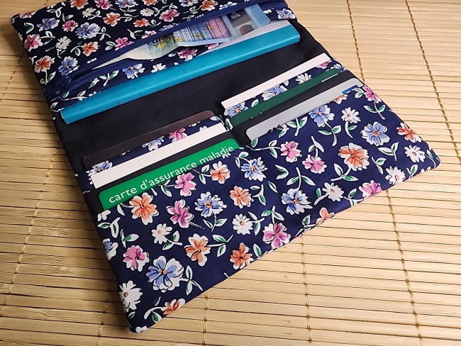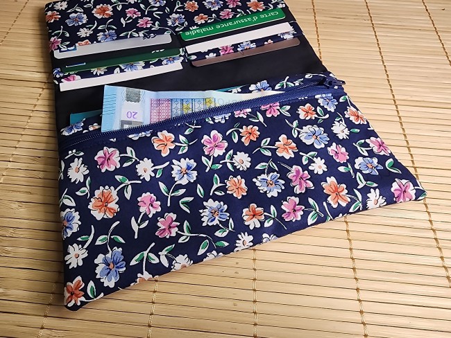 Grand portefeuille porte chéquier tissus fleuris marine et similicuir porte carte passeport fermeture éclaire porte monnaie élastique
