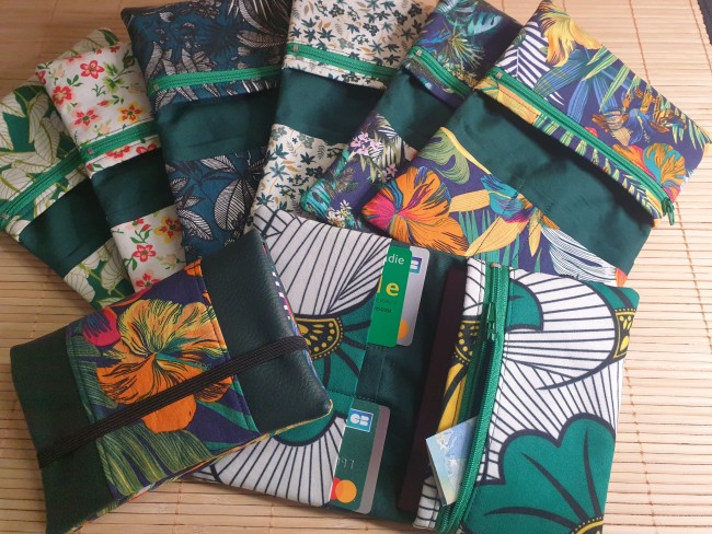 Grand portefeuille étui passeport petites fleurs vert multipoches fermeture éclaire porte monnaie porte carte en tissus fermeture élastique