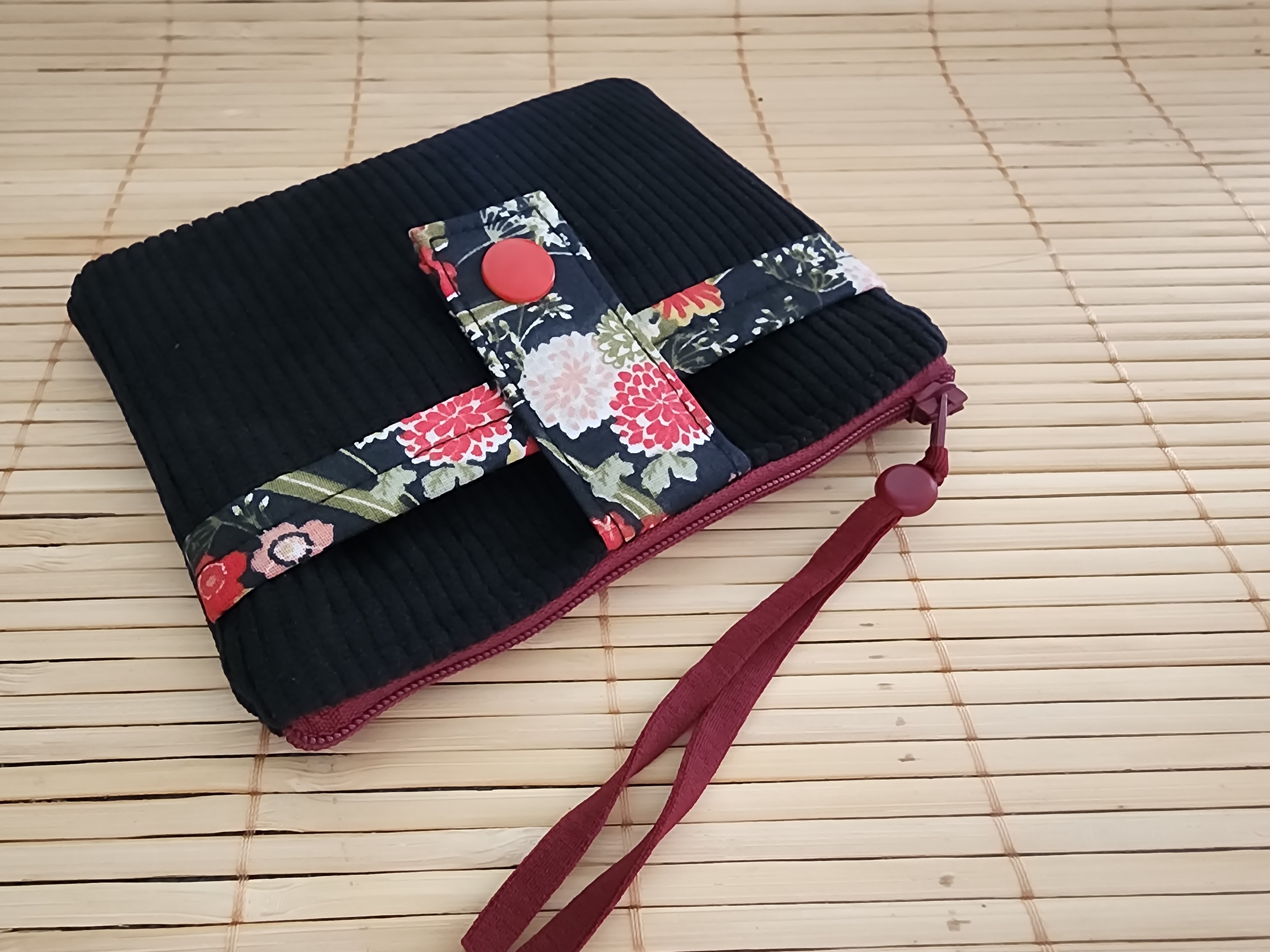 Portefeuille velours côtelé noir et tissus fleurs rouge porte monnaie porte carte fermeture éclaire en tissus fermeture pression