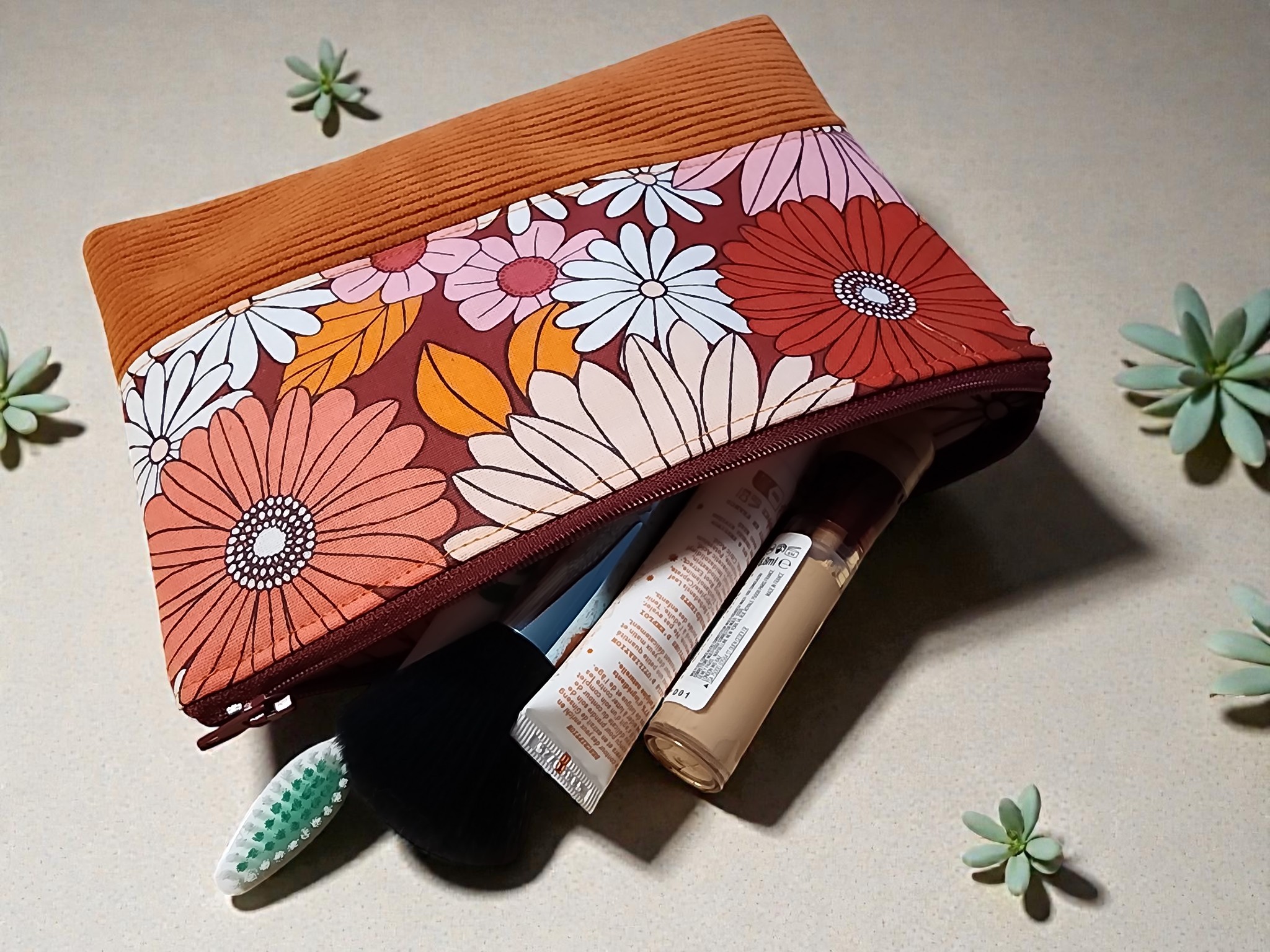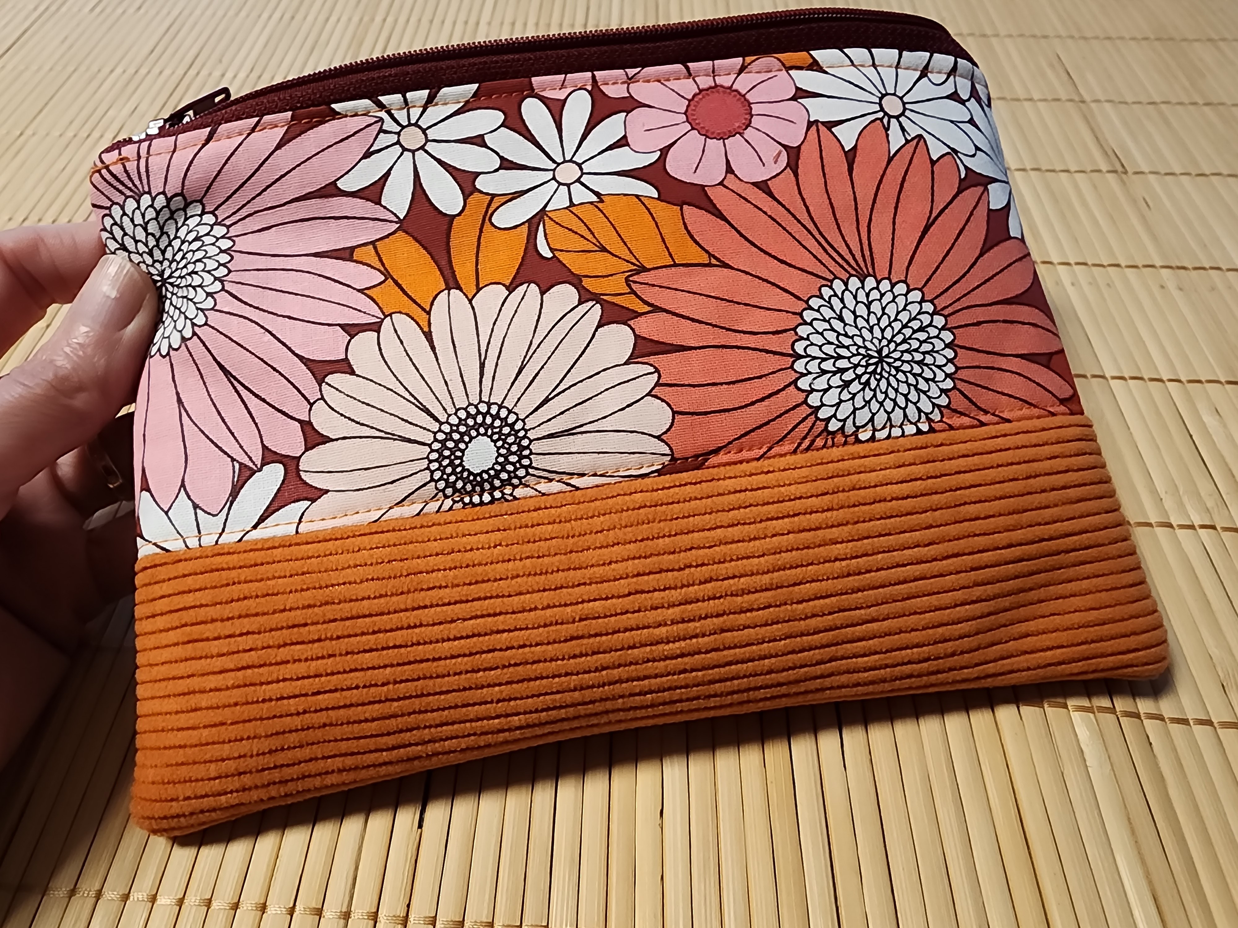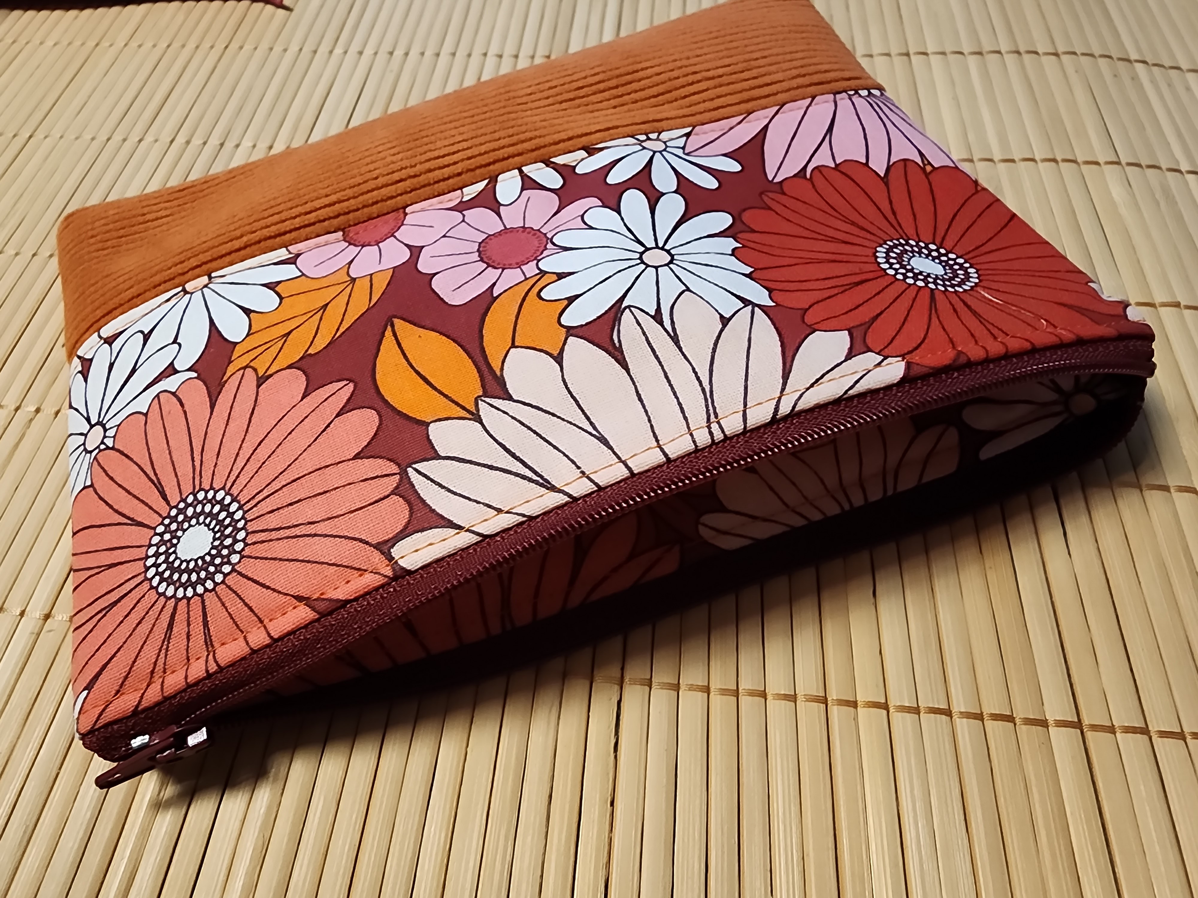 Trousse de toilette en velours côtelé et tissus fleuris orange trousse d'école trousse maquillage plate Idée cadeau!