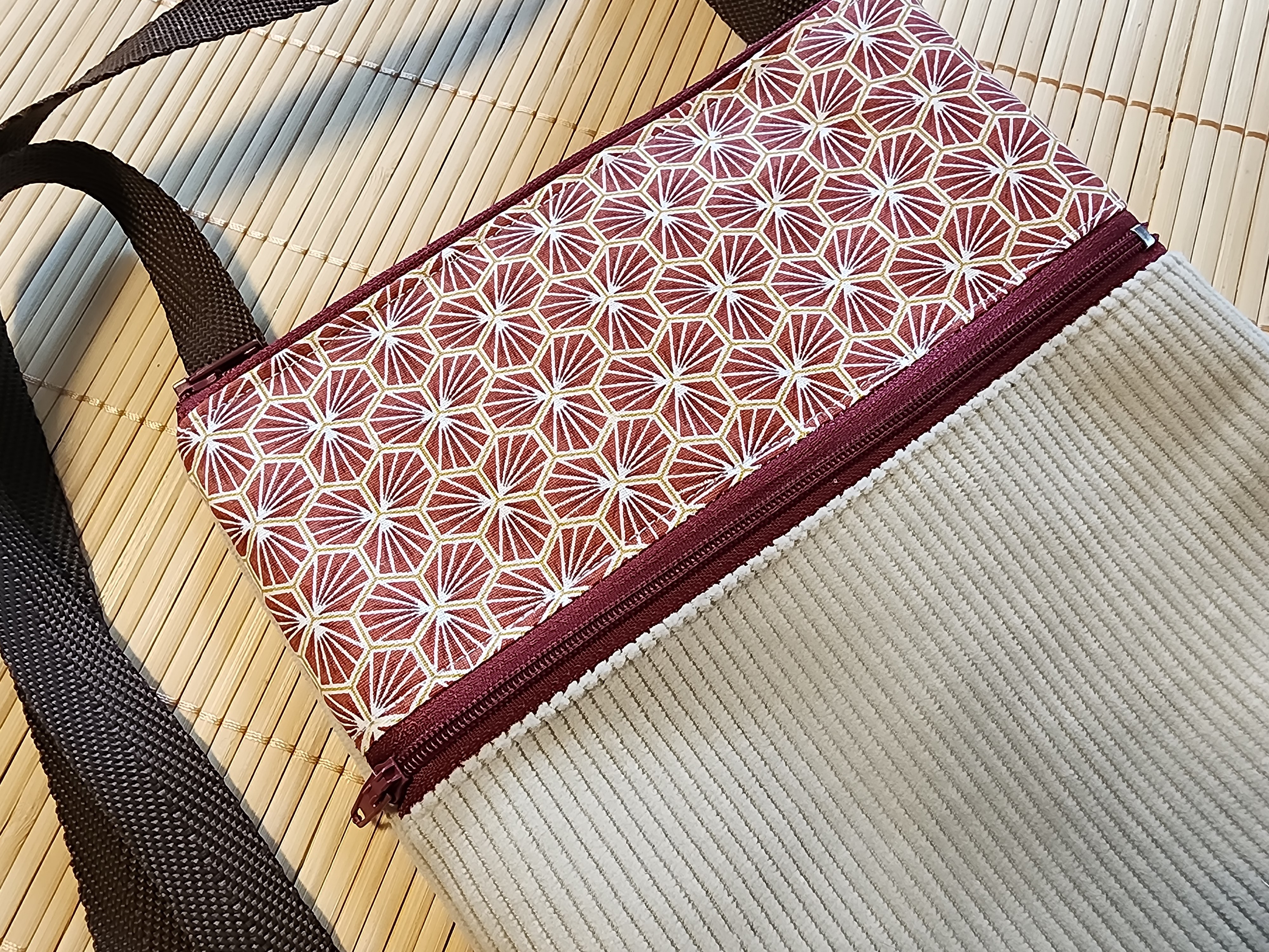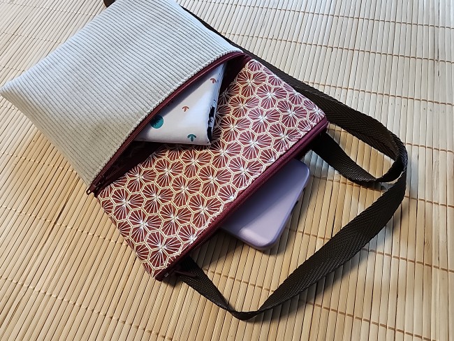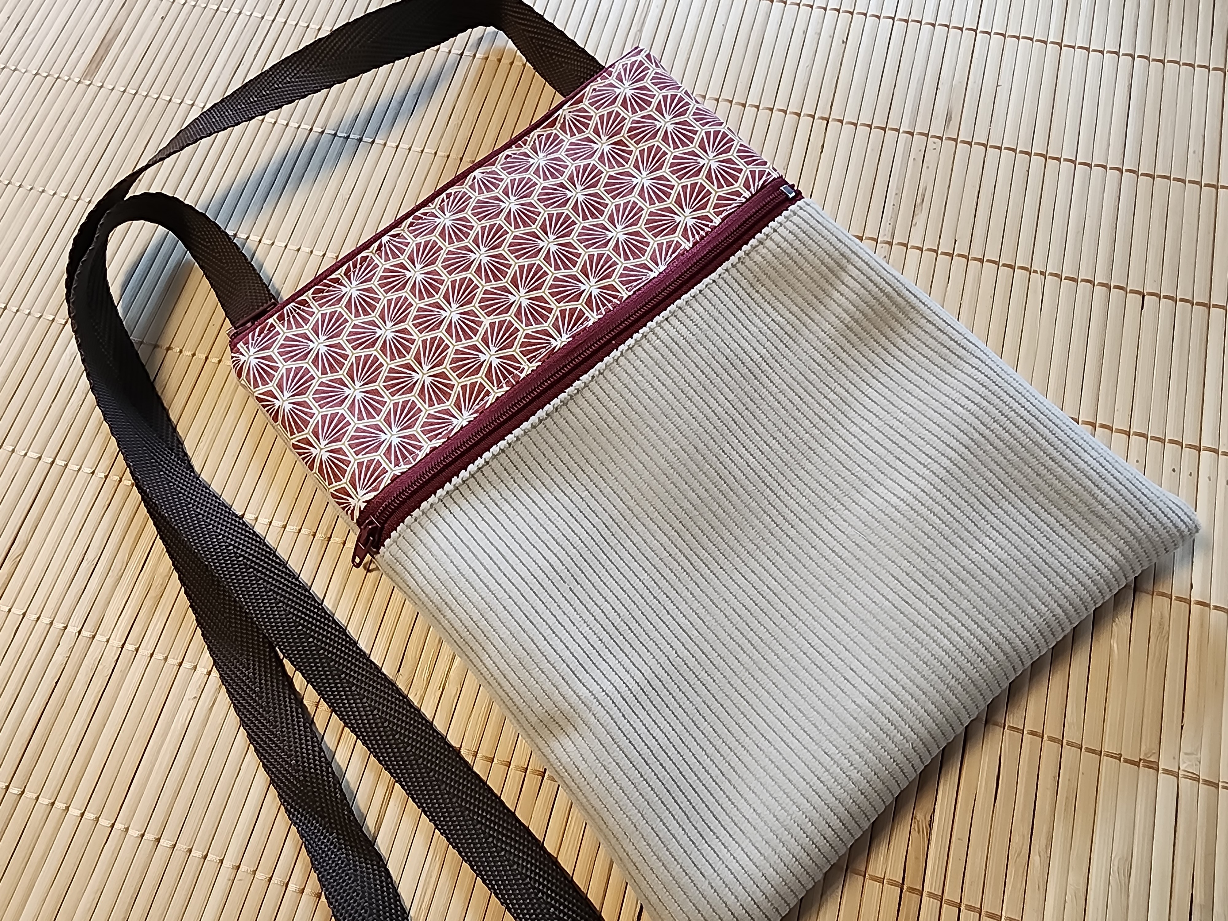 Sac bandoulière velours côtelé beige et tissus riad bordeaux 2 poches zippées pochette téléphone pochette porte monnaie sac a main