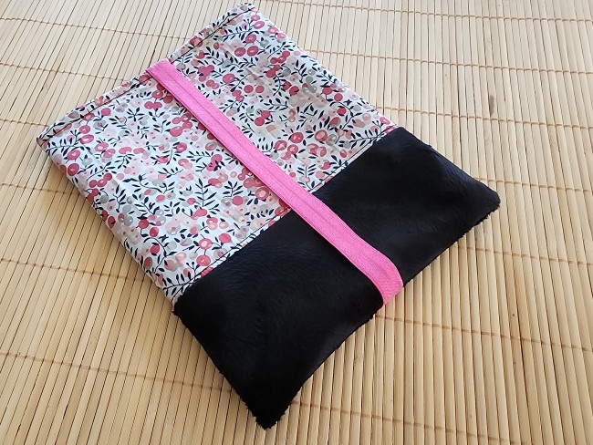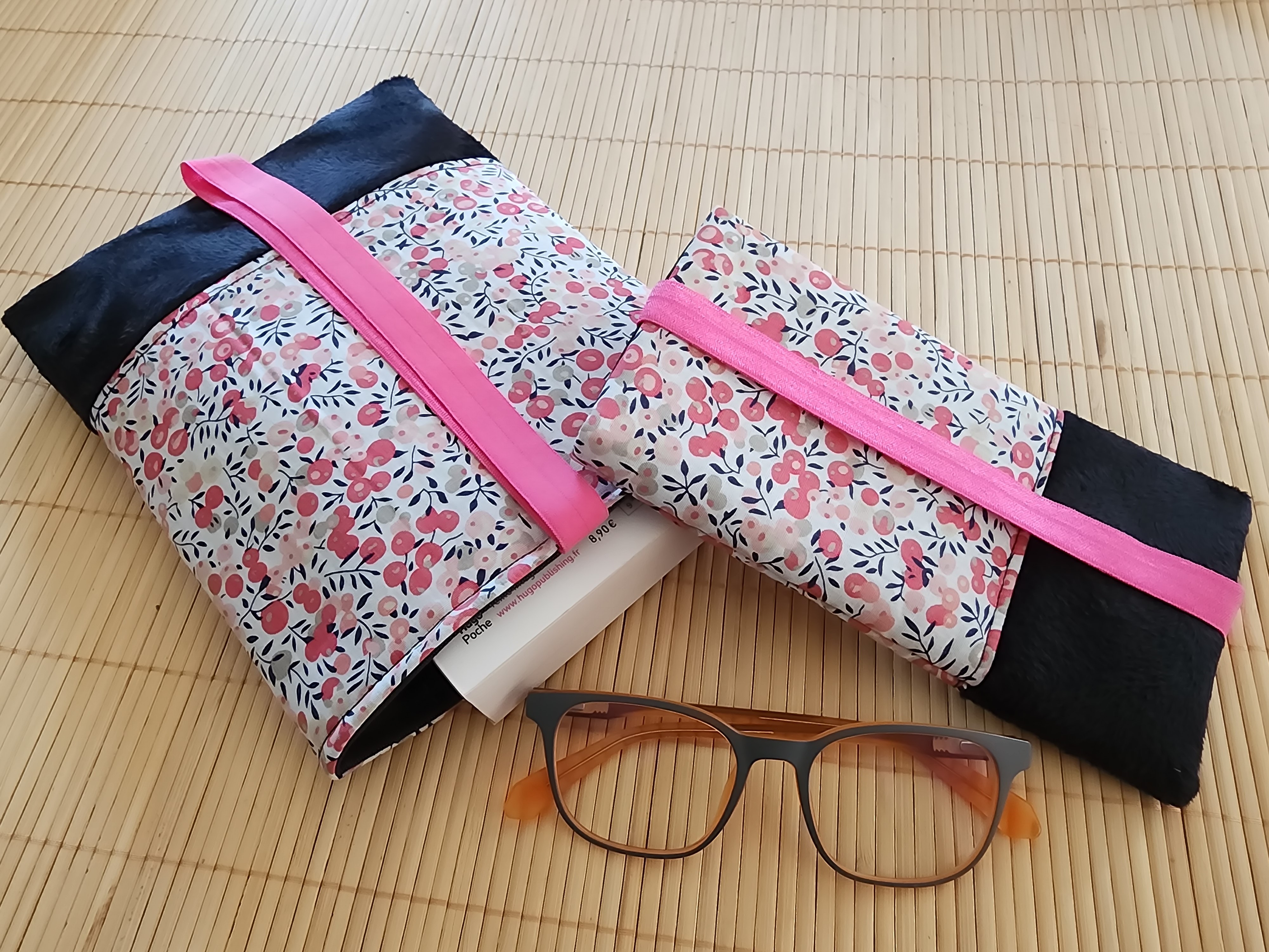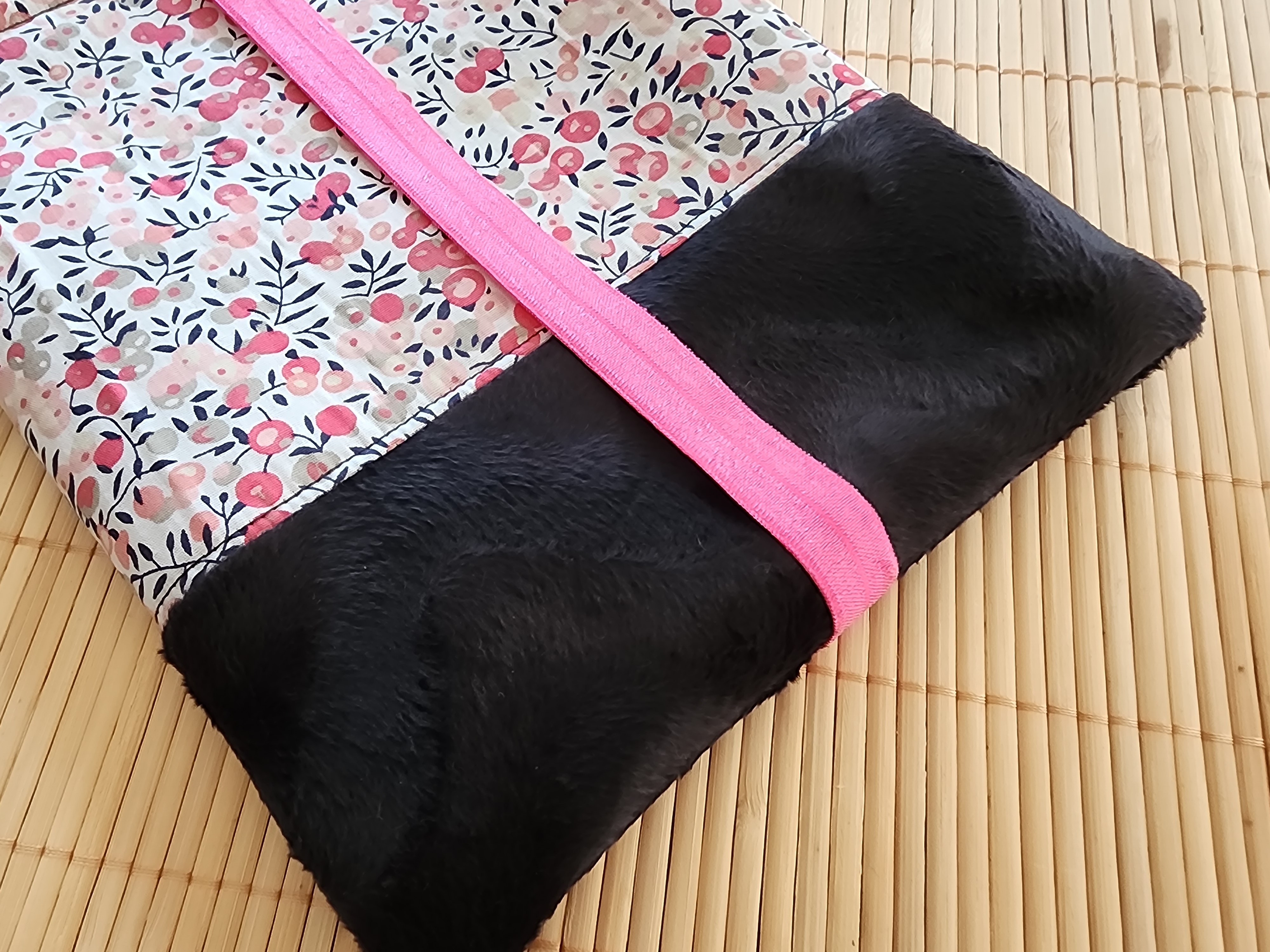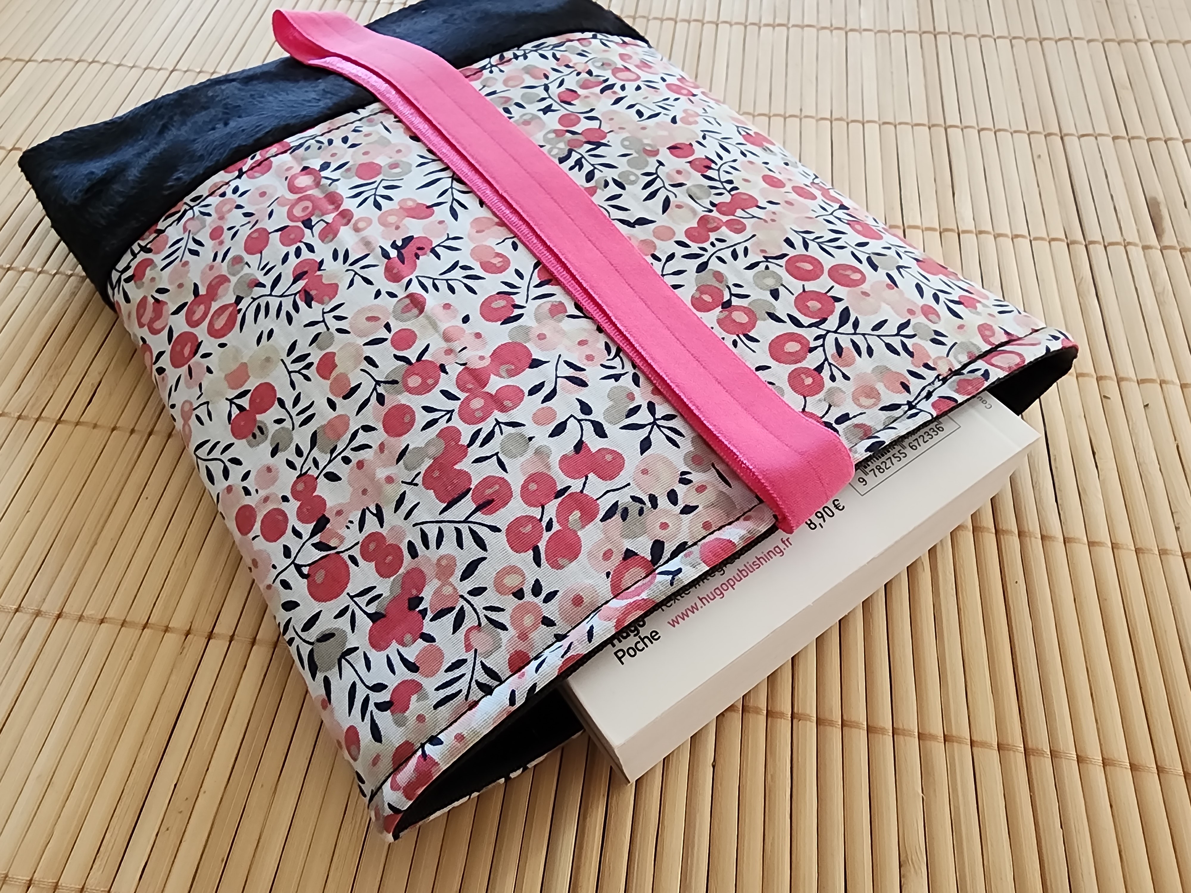 Pochette à livre en tissus fleurs rose et velours noir fermeture élastique étui à livre protection livre de poche