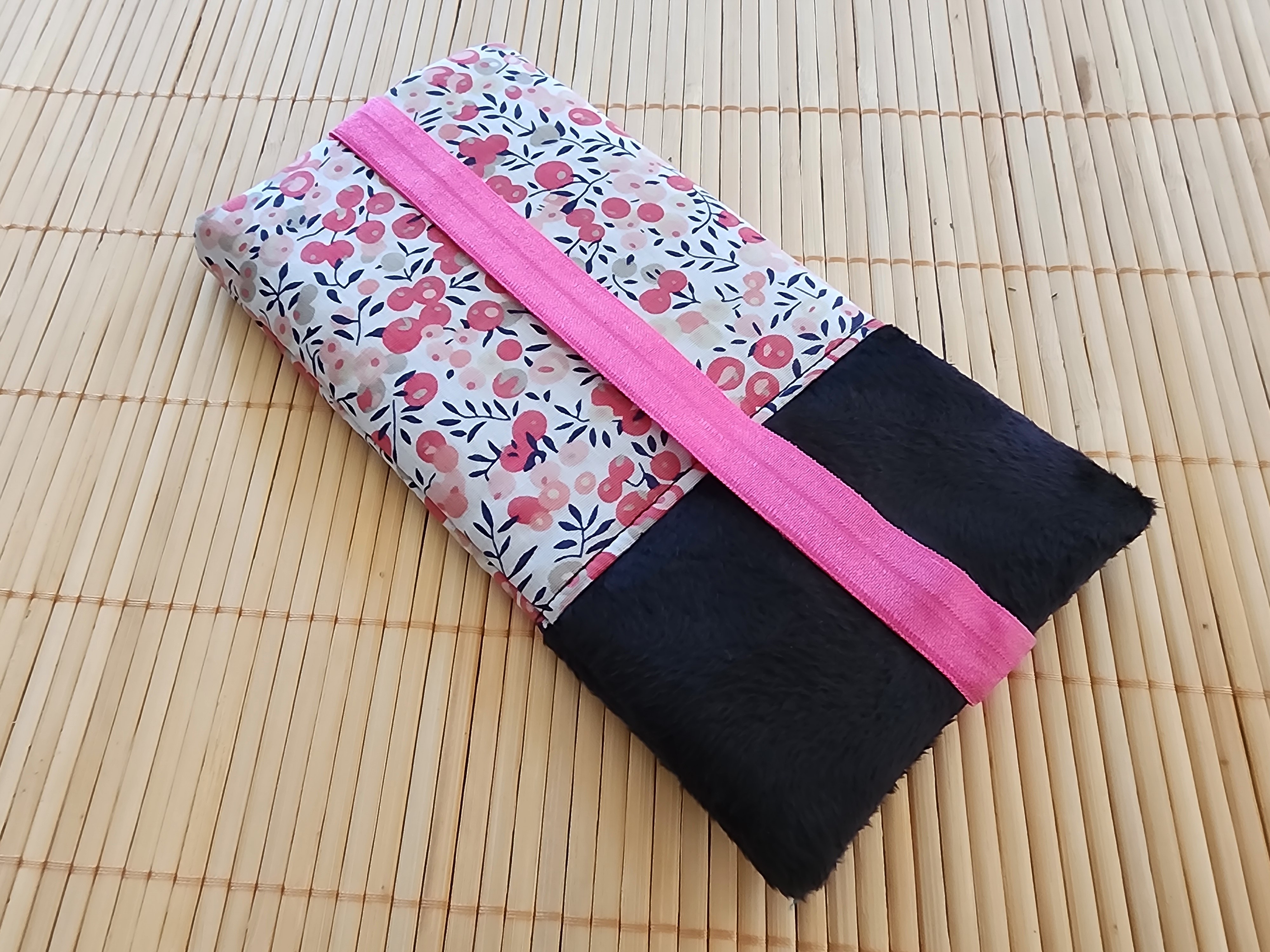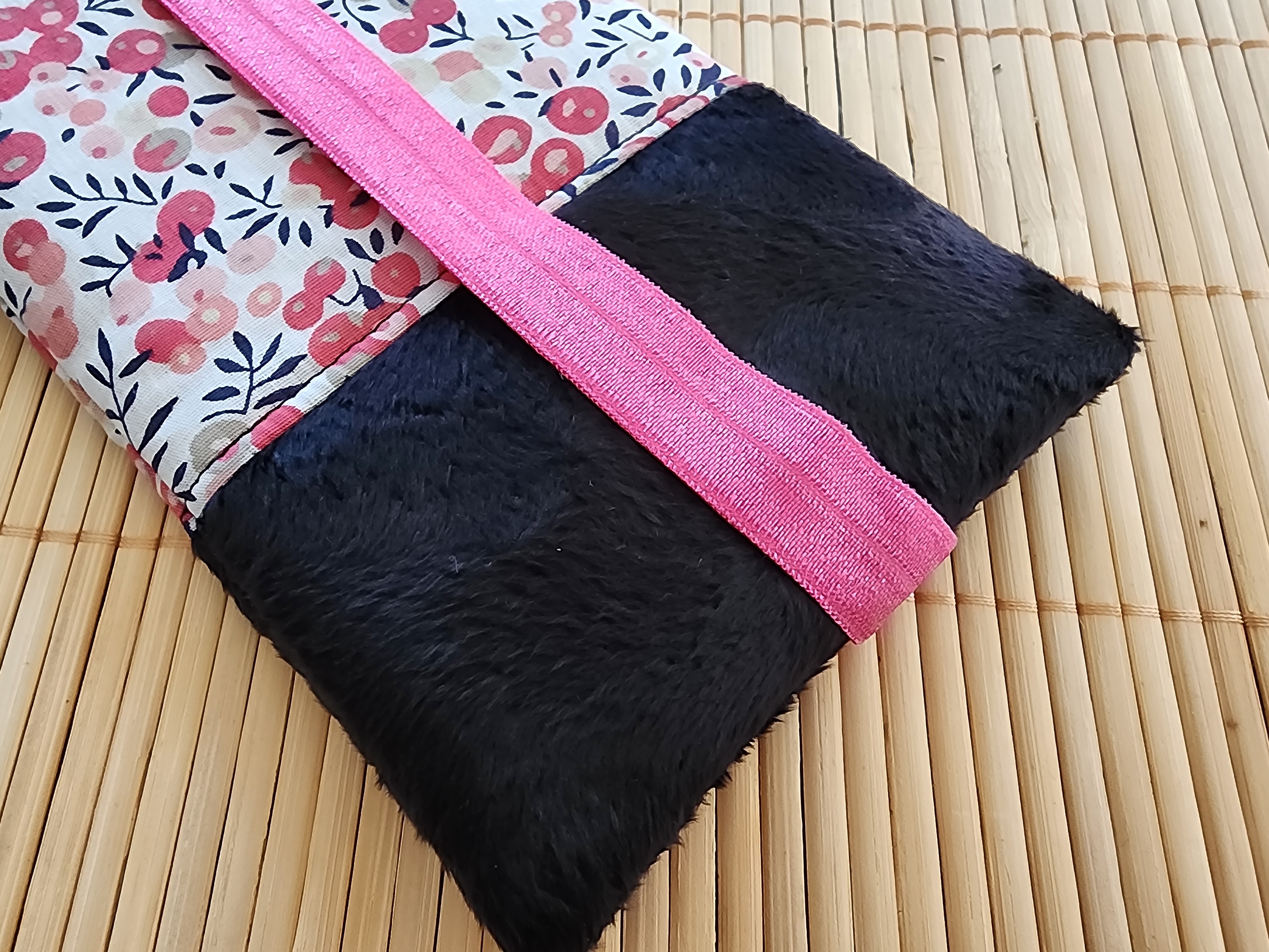 Etui à lunettes en tissus fleurs rose et velours noir fermeture élastique protection lunettes