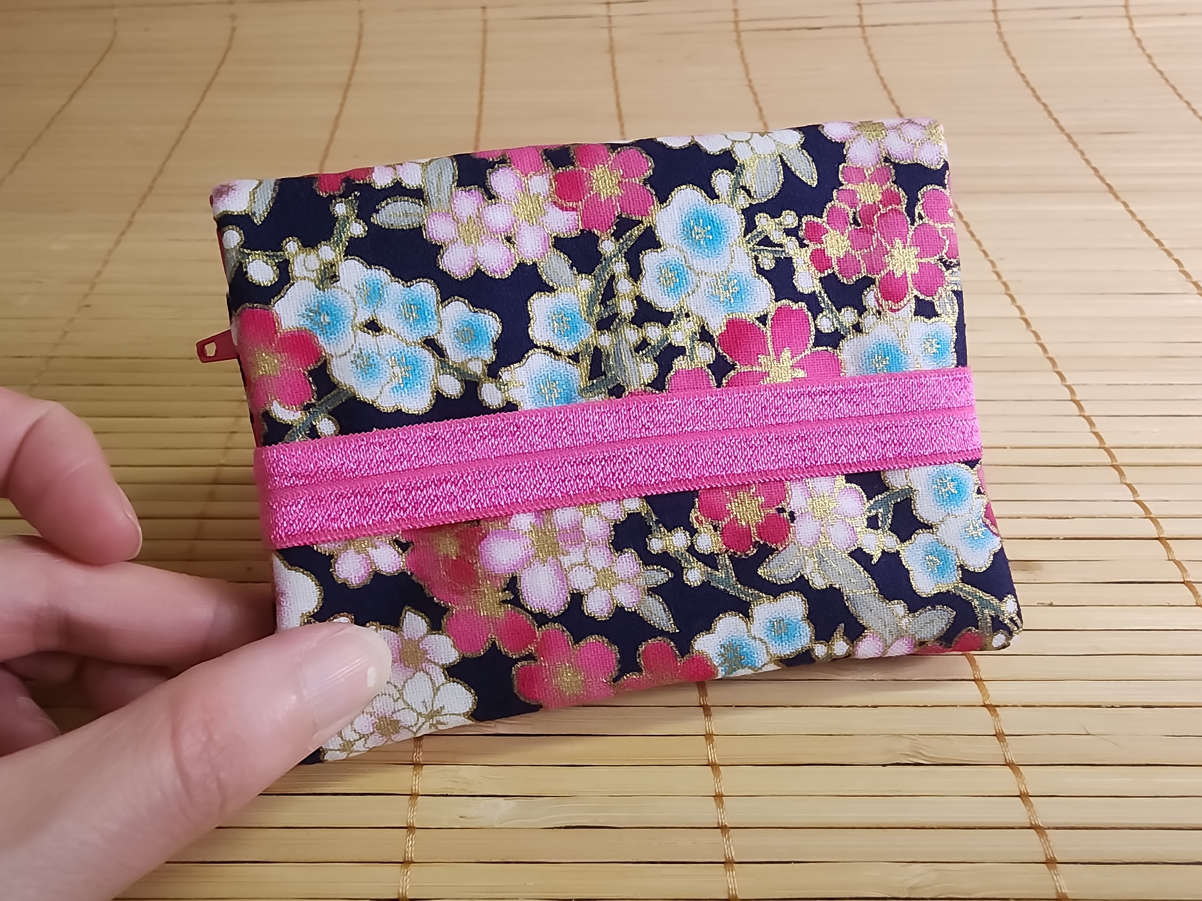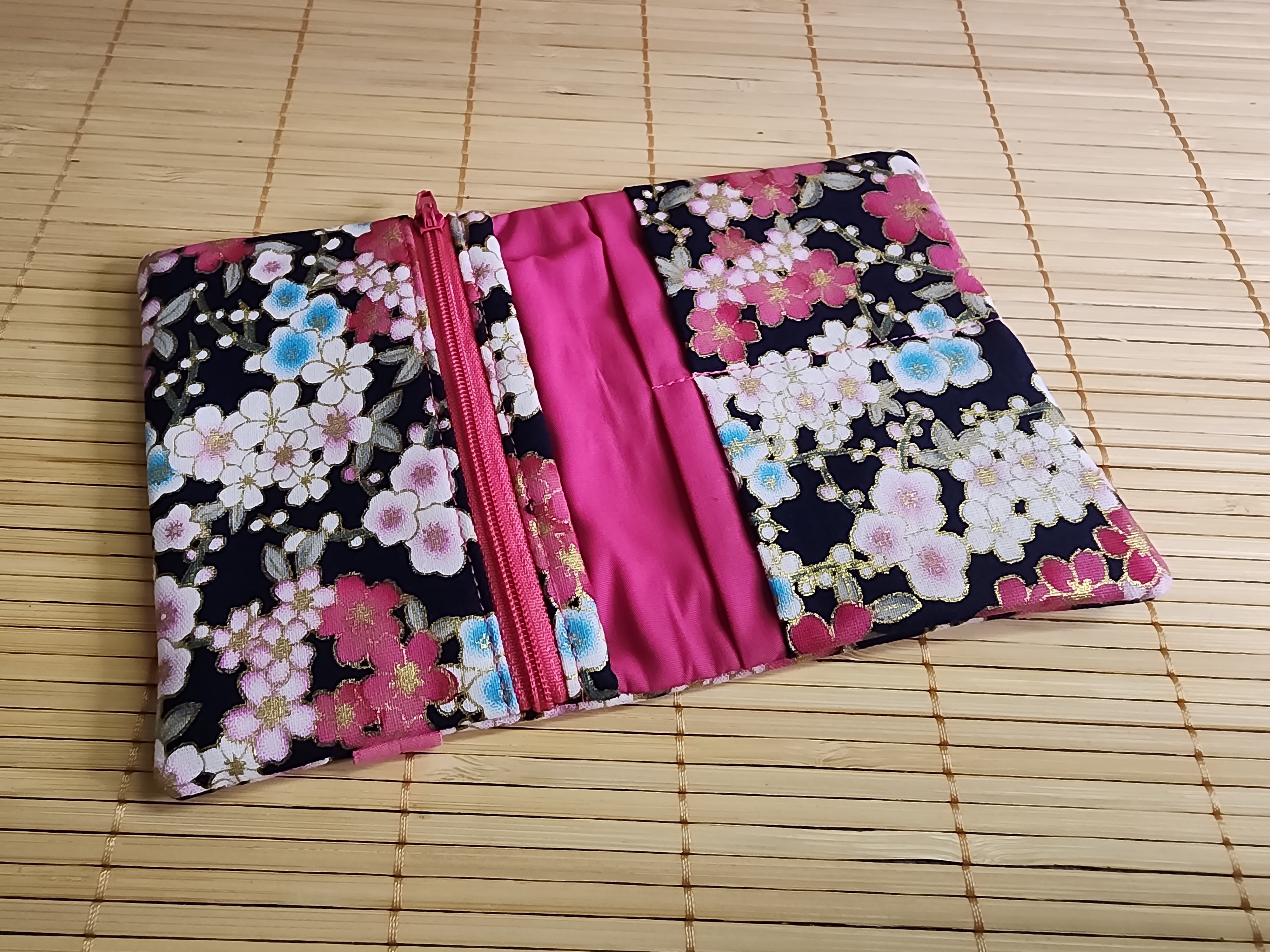 Portefeuille sakura noir et fuchsia multipoches fermeture éclaire porte monnaie porte carte en tissus fermeture élastique portefeuille Diane