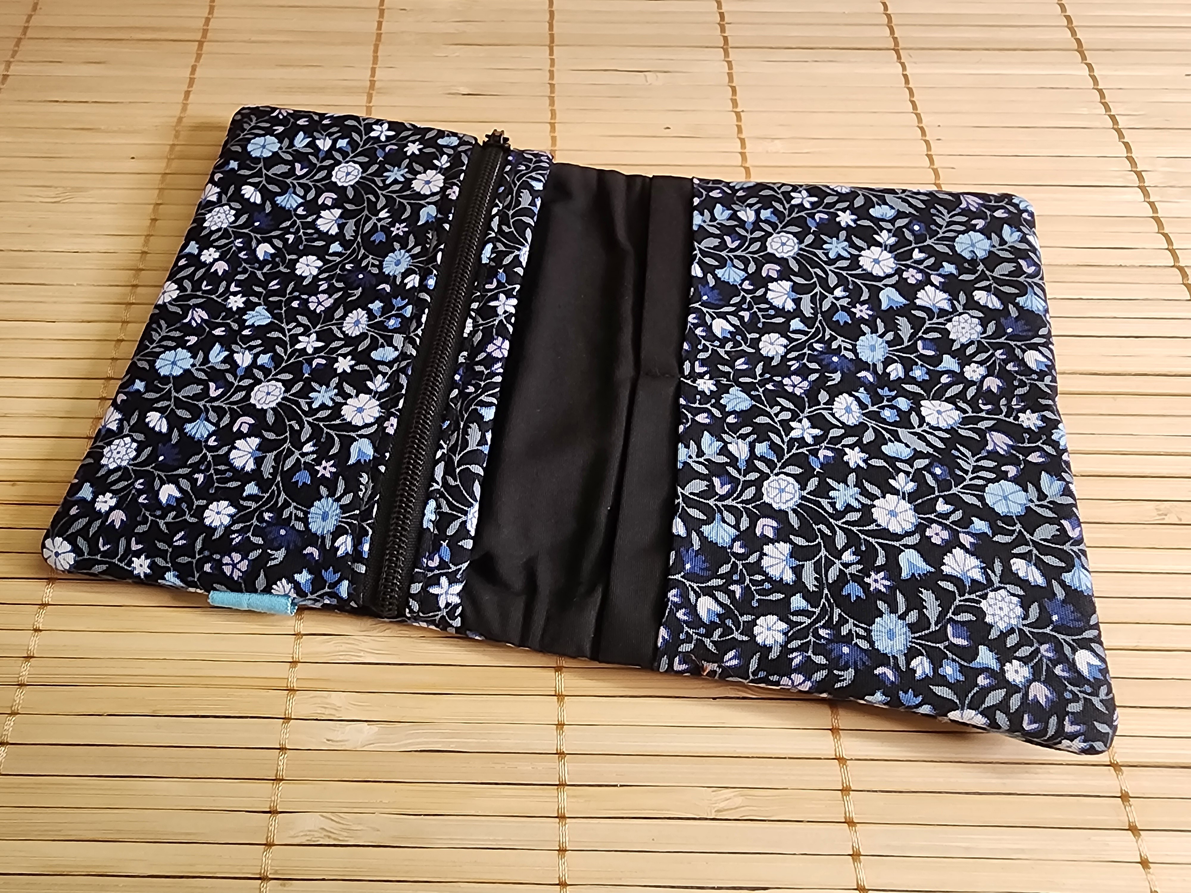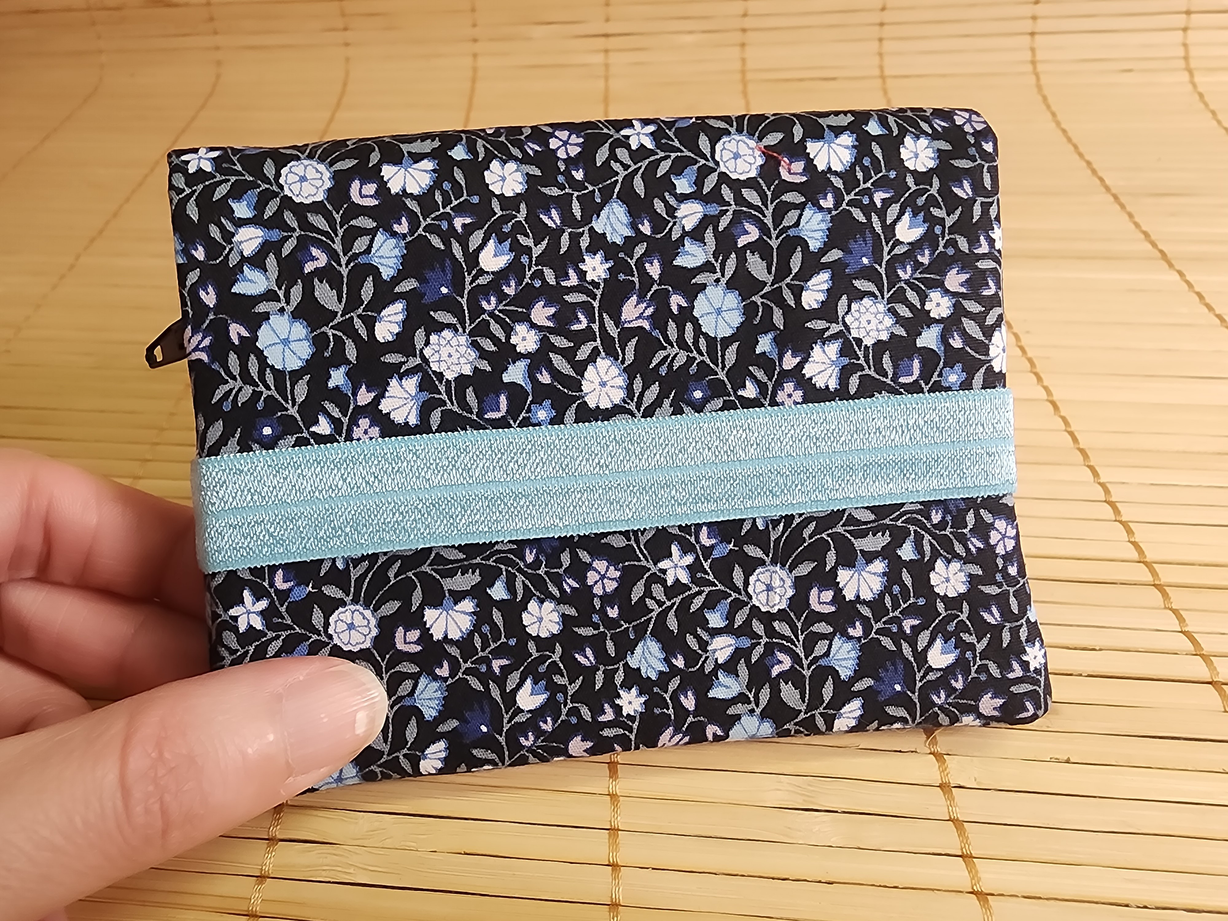 Portefeuille petites fleurs bleu et noir multipoches fermeture éclaire porte monnaie porte carte en tissus fermeture élastique portefeuille Diane