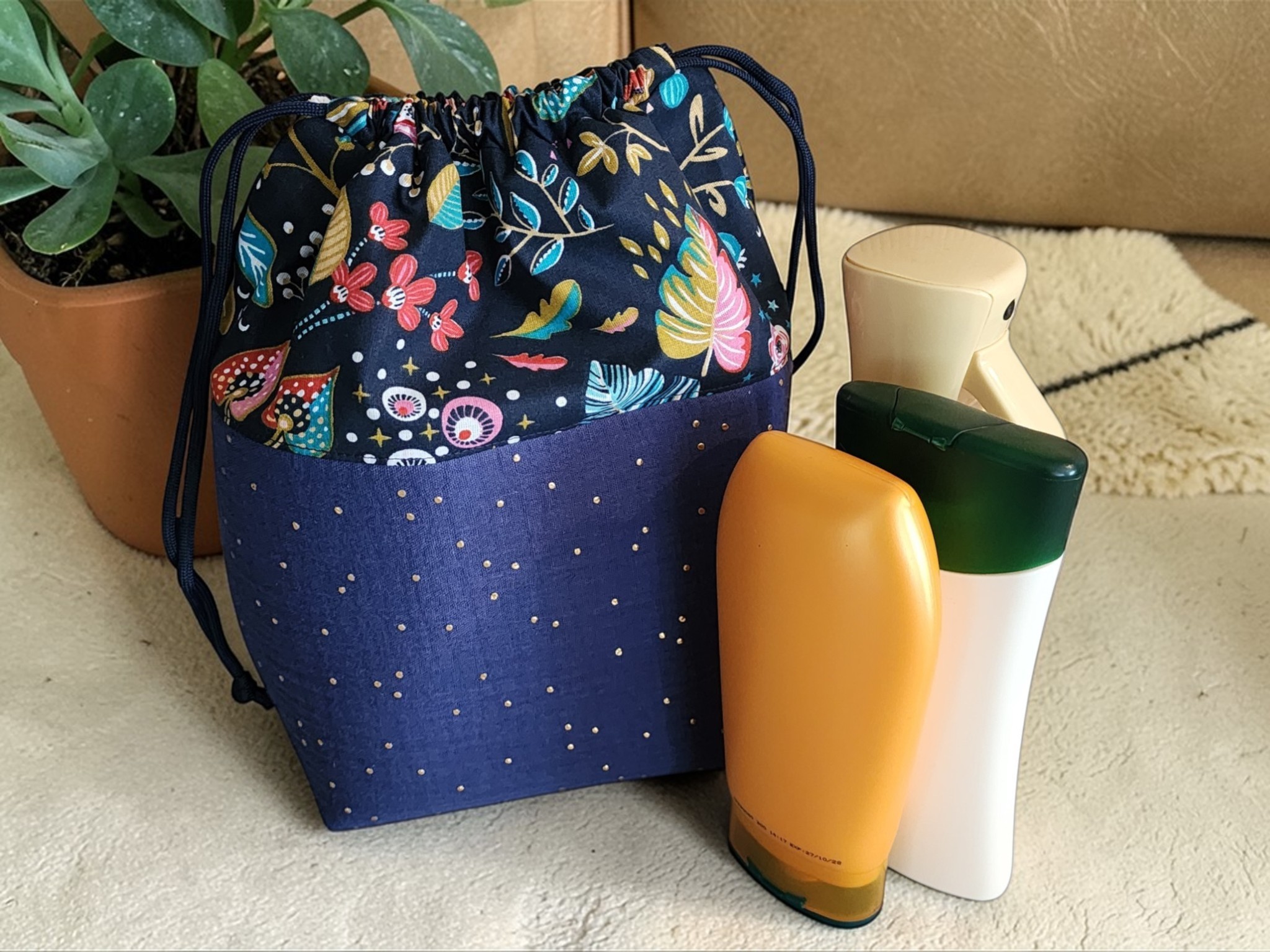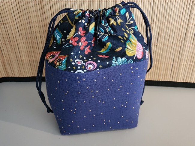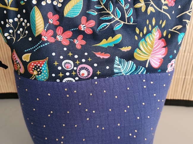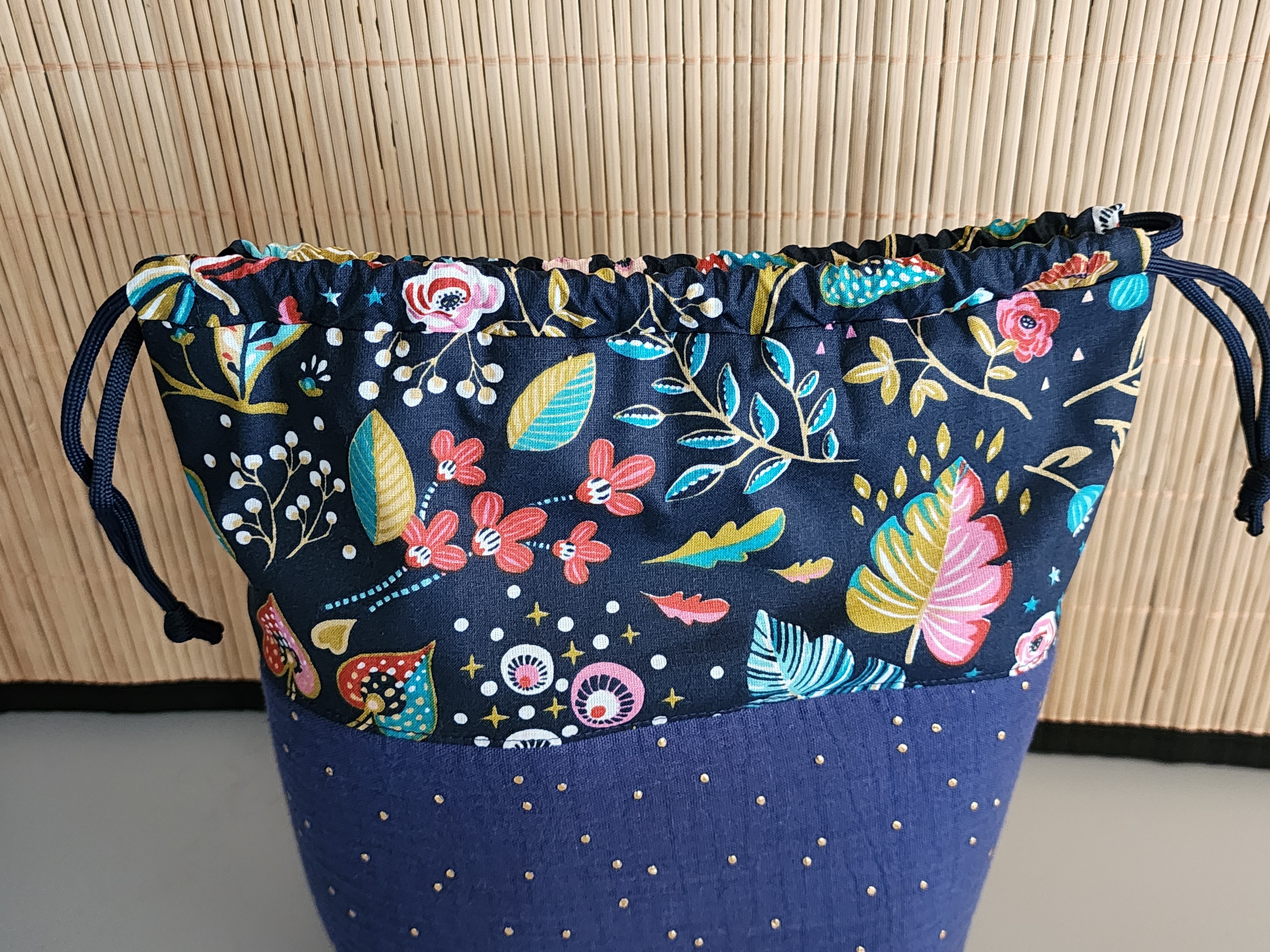 Son design associe un tissu fleuri élégant et une base bleu profond décorée de délicats pois dorés, pour un style à la fois moderne et intemporel.