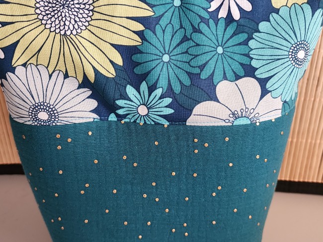 Son design associe un tissu fleuri élégant et une base bleu profond décorée de délicats pois dorés, pour un style à la fois moderne et intemporel.
