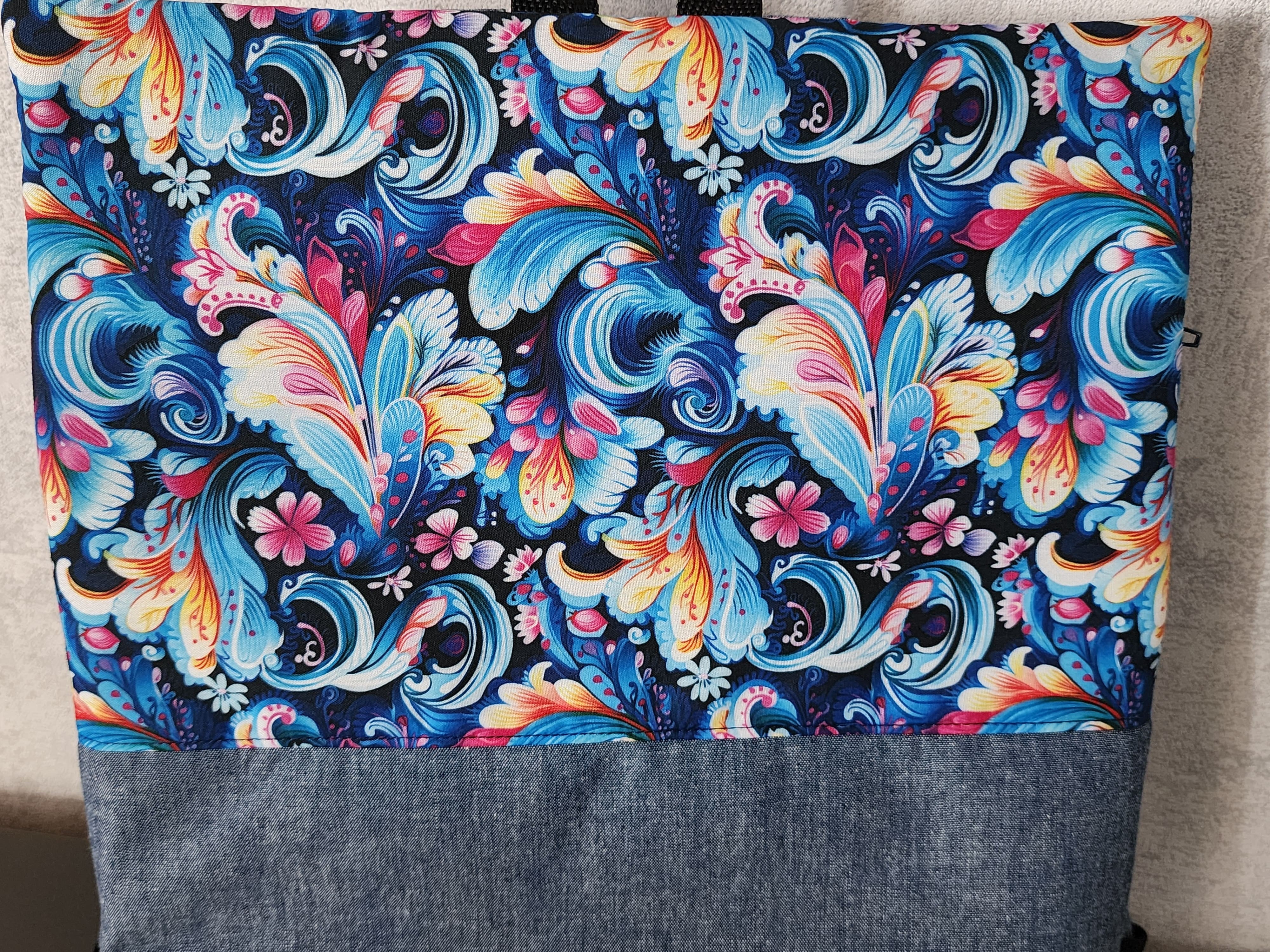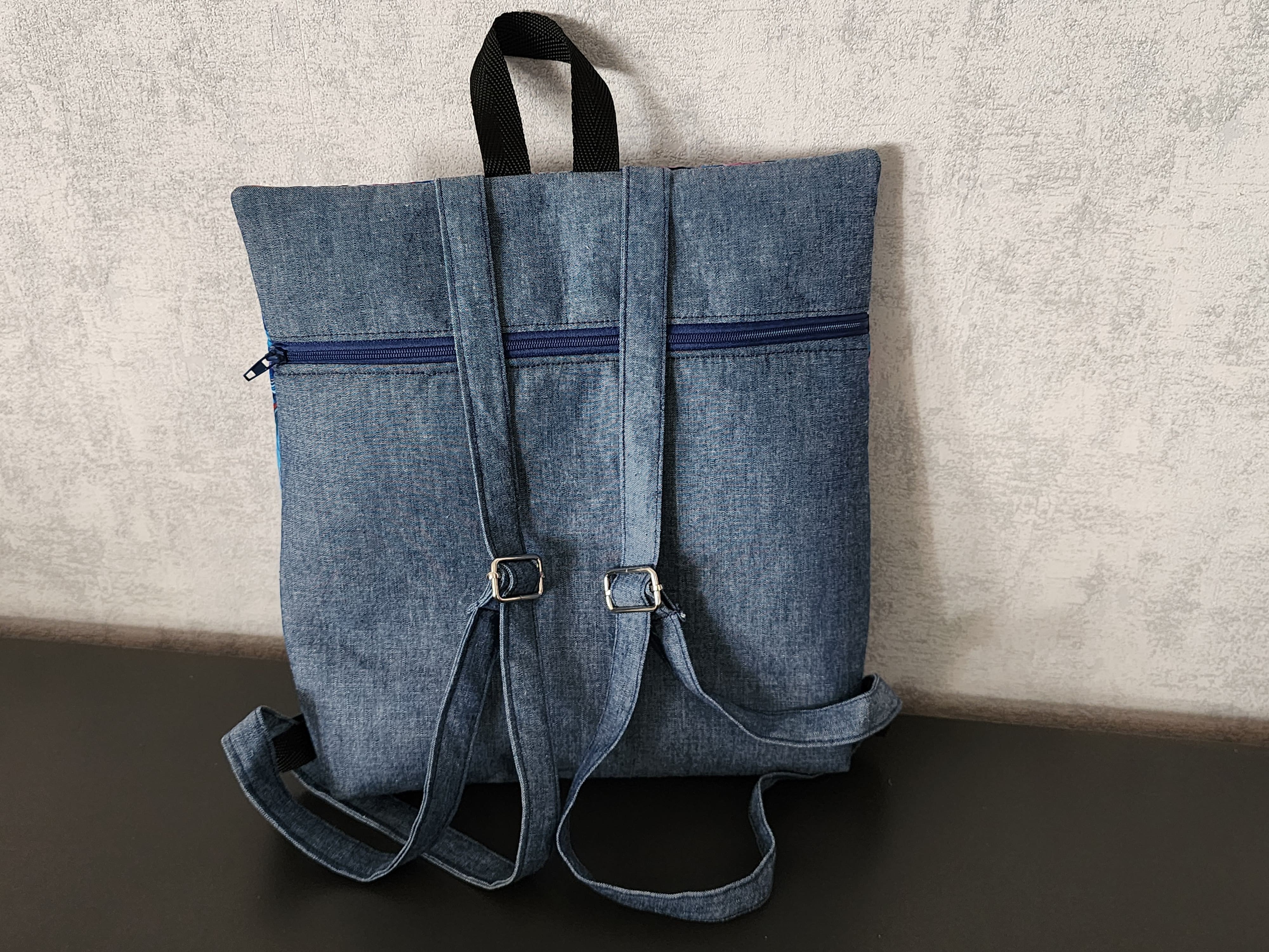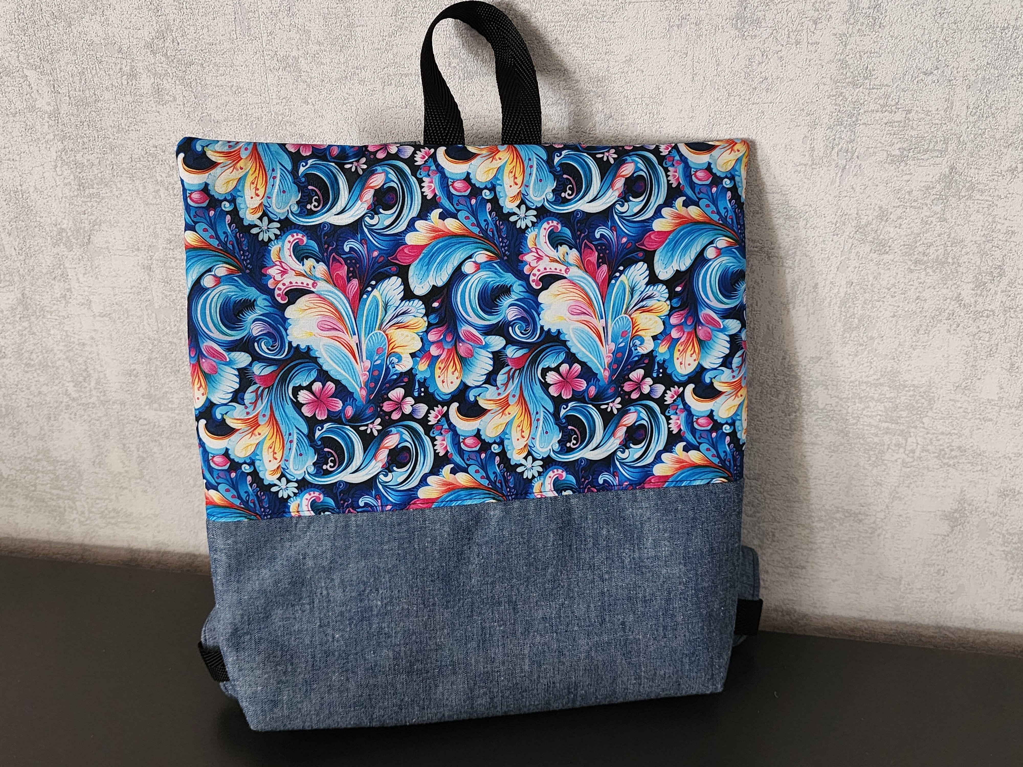 Sac à dos antivol effet jean et coton fleuris – Sac à dos femme / enfant avec poche zippée dos