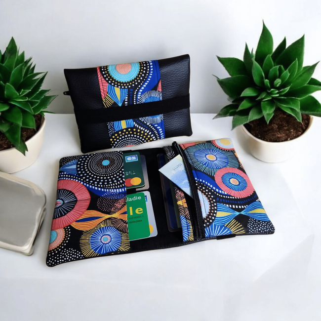 Portefeuille tissus géométrique et similicuir noir multipoches fermeture éclaire porte monnaie porte carte en tissus fermeture élastique