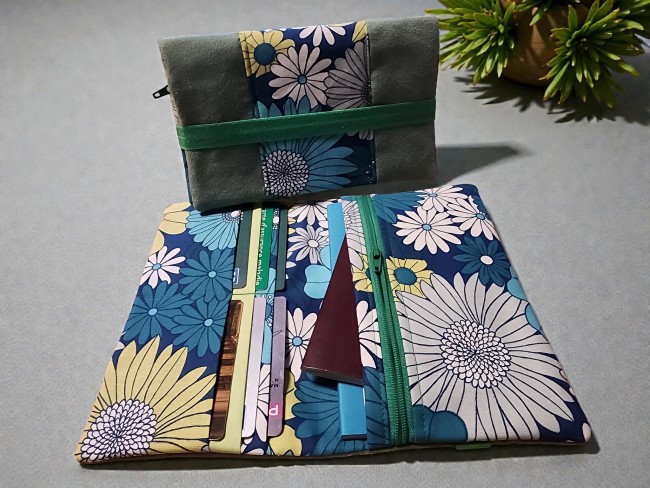 Grand portefeuille porte chéquier tissus fleuris et suédine vert porte carte passeport fermeture éclaire porte monnaie élastique