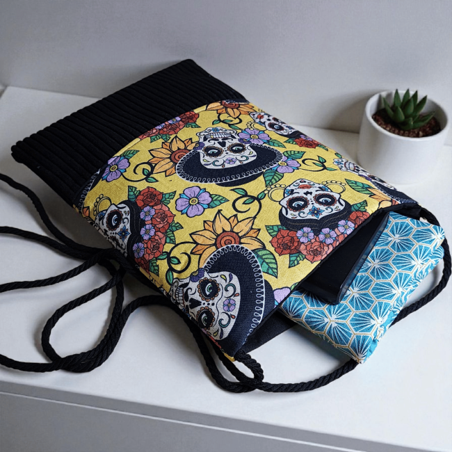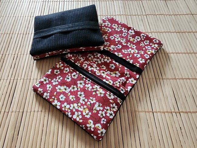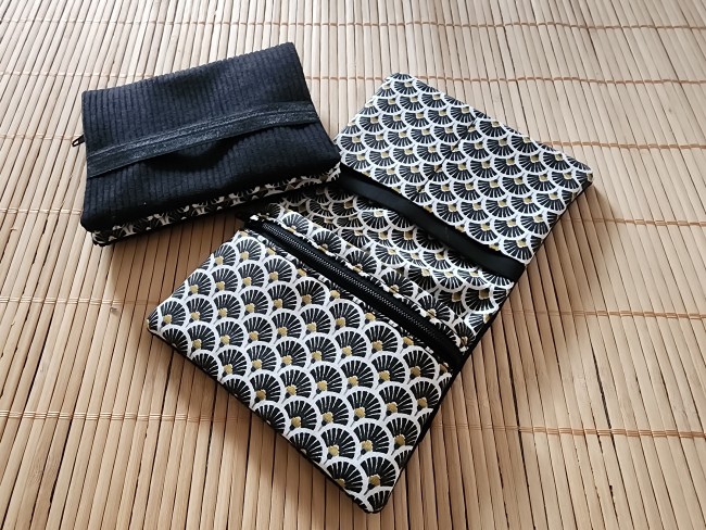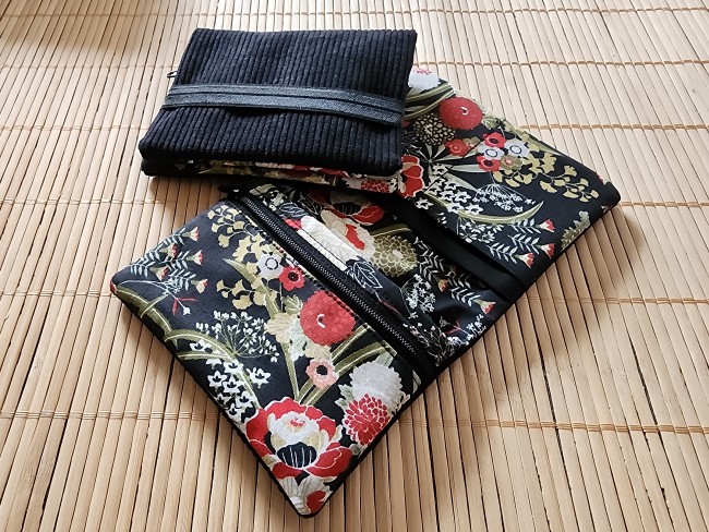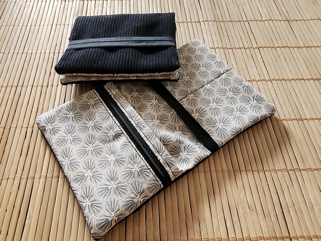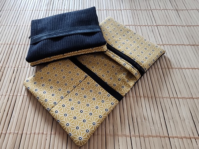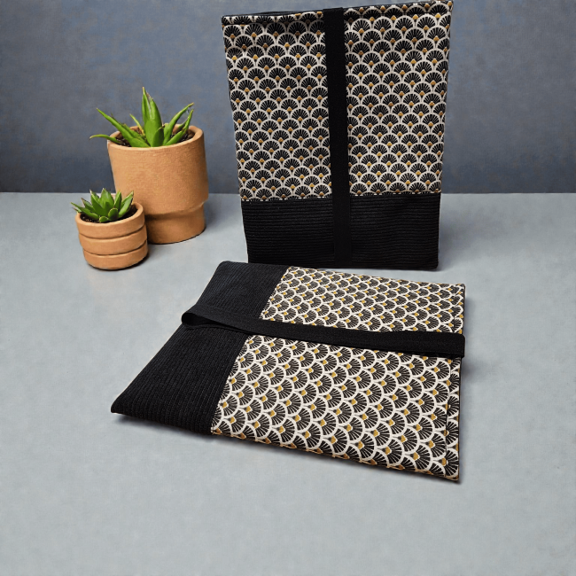 Pochette à livre en tissus éventails noir et velours côtelé fermeture élastique étui à livre protection livre de poche