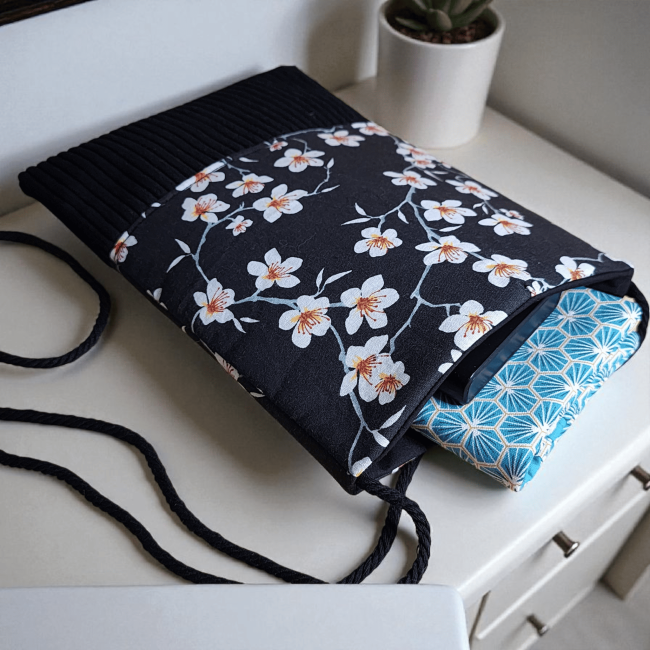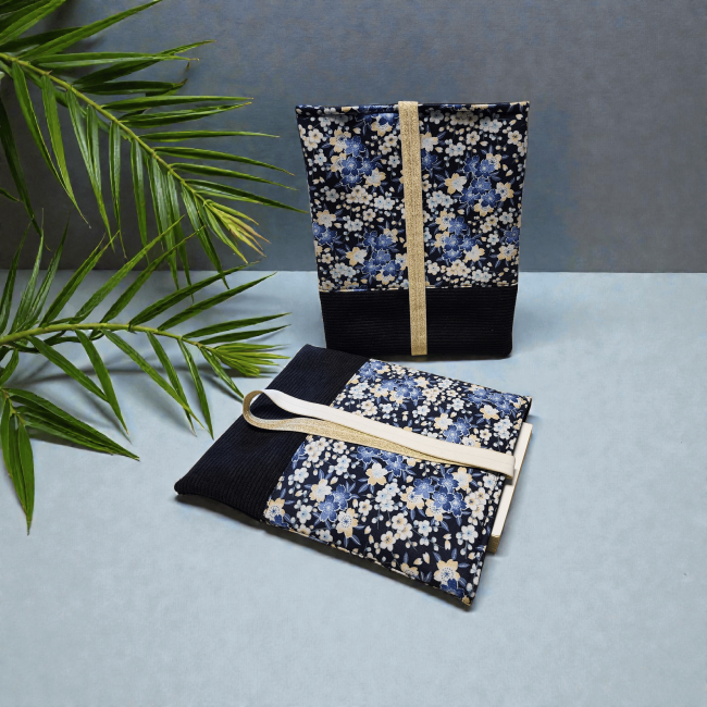 Pochette à livre en tissus fleurs sakura bleu marine et velours côtelé fermeture élastique étui à livre protection livre de poche