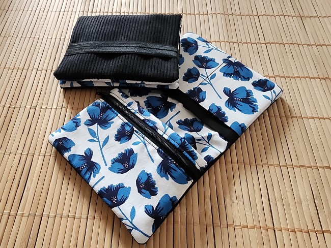 Portefeuille velours côtelé minimaliste ton noir fleurs bleu et noir fermeture éclaire porte monnaie porte carte tissus fermeture élastique