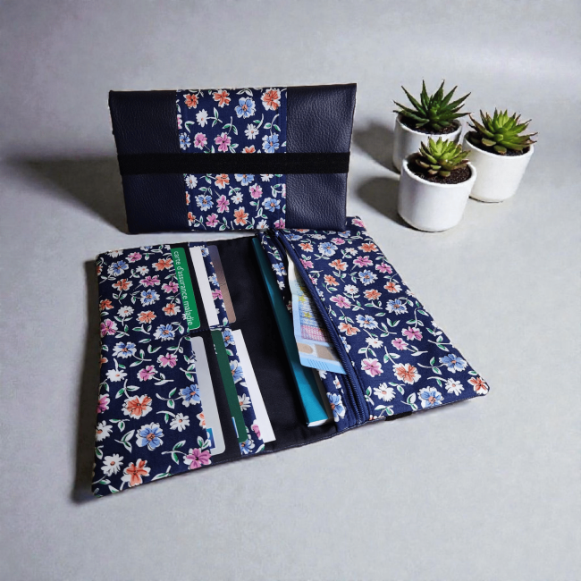 Grand portefeuille porte chéquier tissus fleuris marine et similicuir porte carte passeport fermeture éclaire porte monnaie élastique