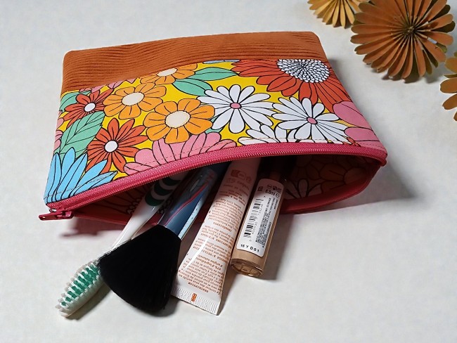 Trousse de toilette en velours côtelé et tissus fleuris orange trousse d'école trousse maquillage plate Idée cadeau!