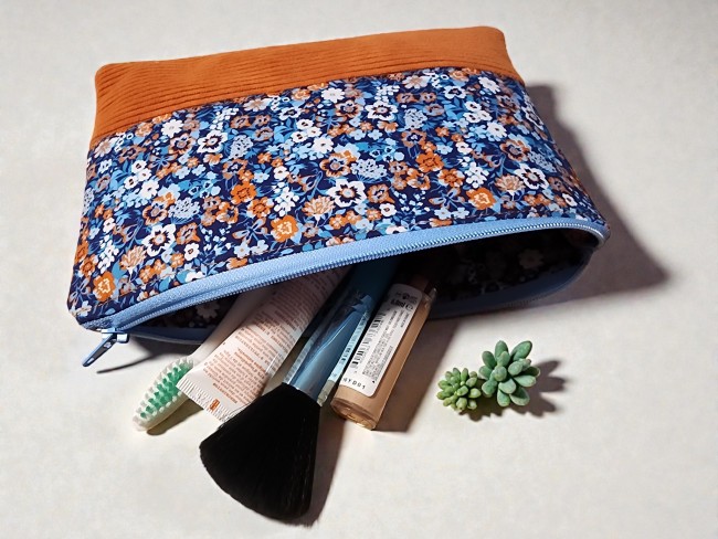 Trousse de toilette en velours côtelé et tissus fleuris bleu orange trousse d'école trousse maquillage plate Idée cadeau!