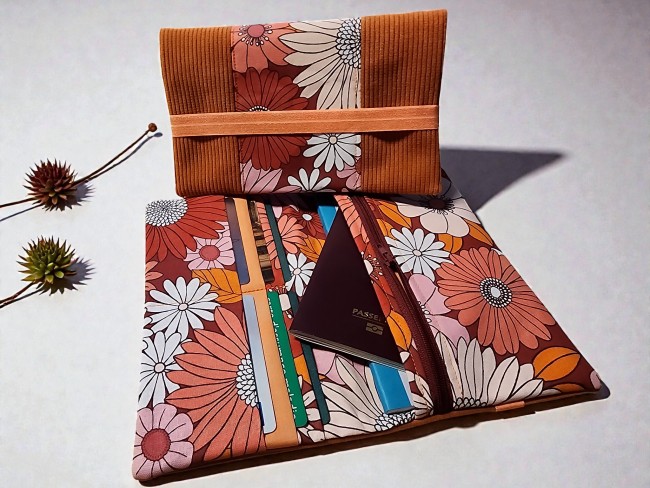 Grand portefeuille porte chéquier tissus fleuris et velours côtelé orange porte carte passeport fermeture éclaire porte monnaie élastique