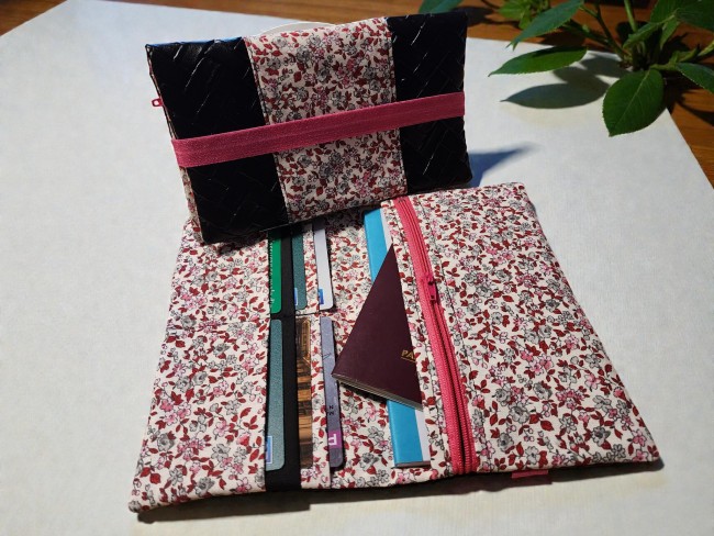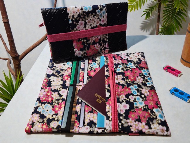Portefeuille velours côtelé noir et tissus fleuris japonais étui passeport porte monnaie porte carte en tissus bouton pression