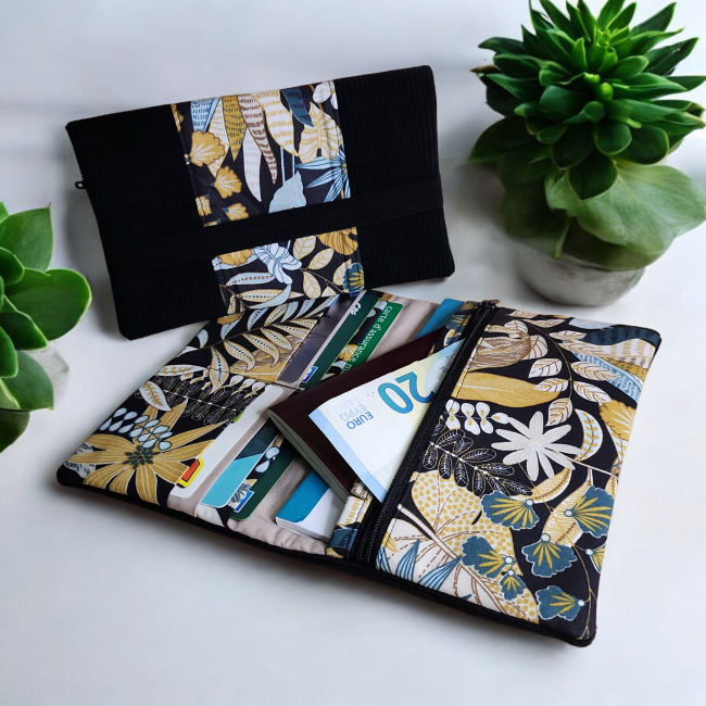 Grand portefeuille porte chéquier tissus feuillage et velours noir porte carte passeport fermeture éclaire porte monnaie élastique