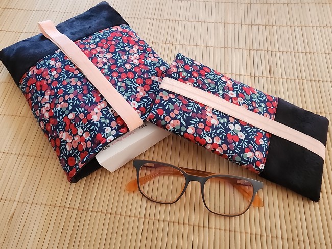 Pochette à livre en tissus fleurs rose et velours noir fermeture élastique étui à livre protection livre de poche