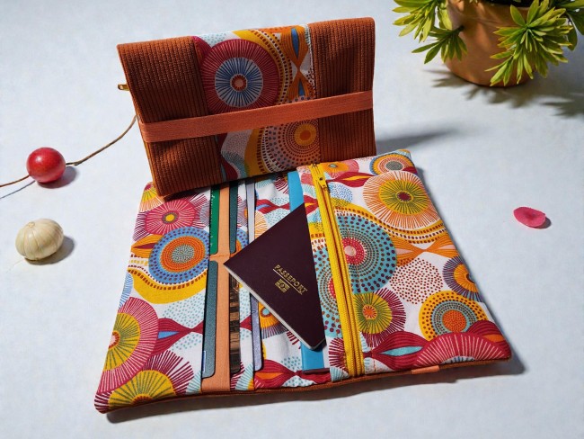 Grand portefeuille porte chéquier tissus géométrique et velours côtelé orange porte carte passeport fermeture éclaire élastique