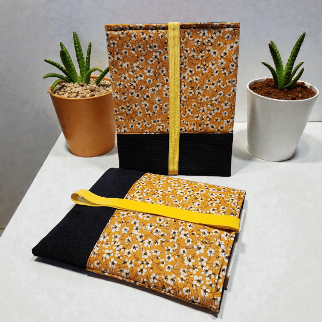Pochette à livre en tissus fleurs amandier jaune et velours côtelé fermeture élastique étui à livre protection livre de poche