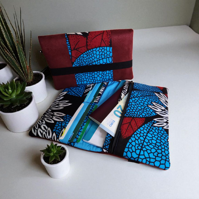 Grand portefeuille porte chéquier tissus wax feuillage et velours bordeaux porte carte passeport fermeture éclaire porte monnaie élastique