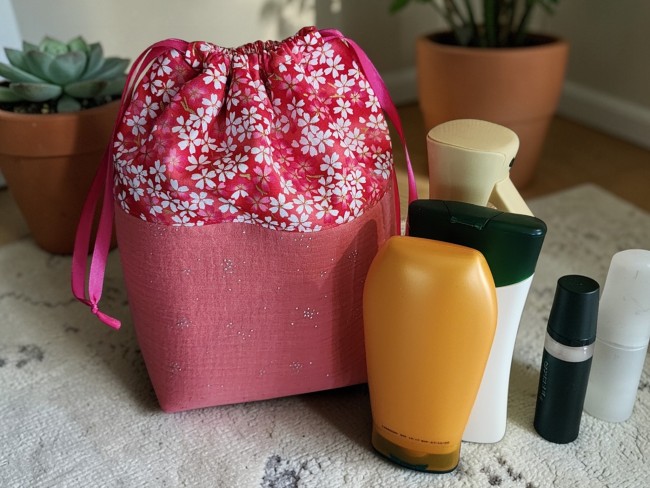 Trousse de toilette polochon petites fleurs rose et double gaz Pochette de voyage en tissu Rangement cosmétique Cadeau pratique et élégant