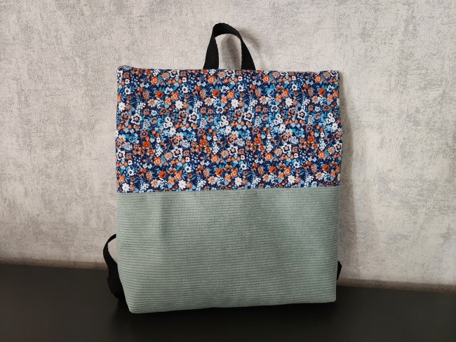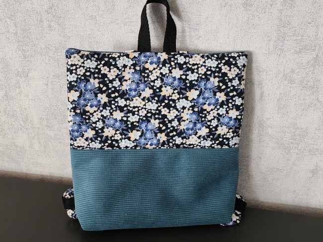 Sac à dos antivol tissus fleuris et velours côtelé bleu – Sac à dos femme / enfant avec poche zippée dos