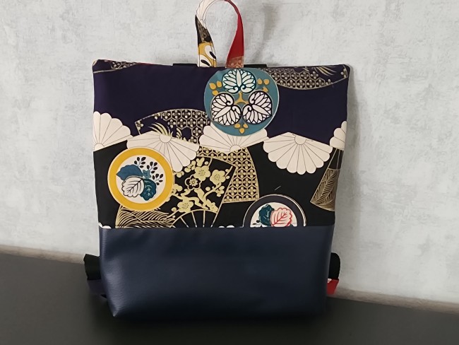 Sac à dos antivol tissus japonais et similicuir marine – Sac à dos femme / enfant avec poche zippée dos