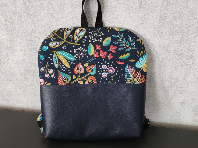 Sac à dos antivol ancolie fleurs et similicuir marine – Sac à dos femme / enfant avec poche zippée dos