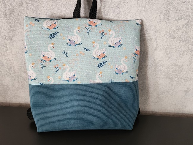 Sac à dos antivol velours côtelé et cygnes bleu – Sac à dos femme / enfant avec poche zippée dos